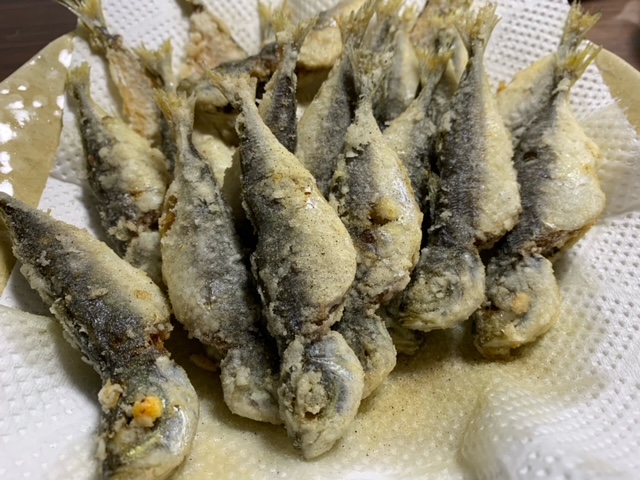 今回はから揚げが食べたかったので鱗もゼイゴもそのまま、手でエラと内蔵を取り、塩で洗って片栗粉降って二度揚げ♪ 揚げたてに塩コショウで優勝!!頭から骨までサクサクでおつまみにサイコーです!! ビールに超合うと思います!! 飲めないから分かりませんが(笑)
