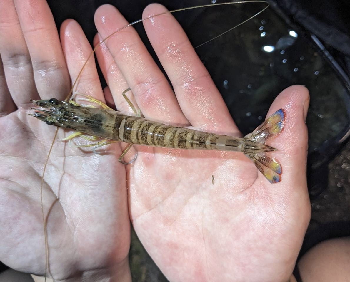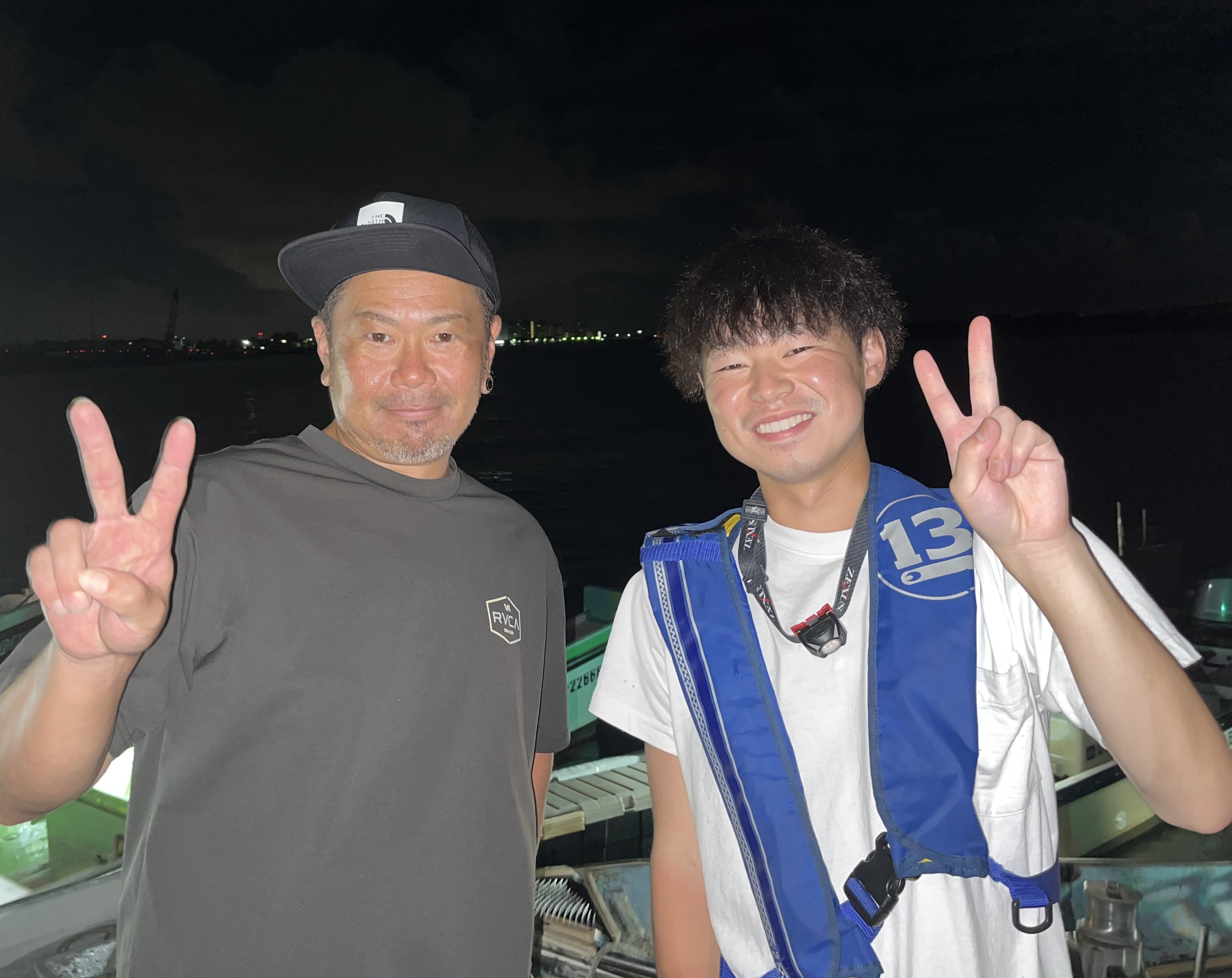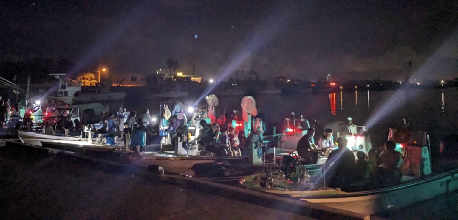 出船は、22時半でポイントに到着してみるとエビがすでに流れている!さっそく準備してエビをひたすらすくってすくって掬いまくりました!エビを掬っていると60以上は確実にあるシーバスにタチウオと色々な魚が周りにたくさん!この日は釣れませんでしたが、ロッドを準備していくのもおすすめです!