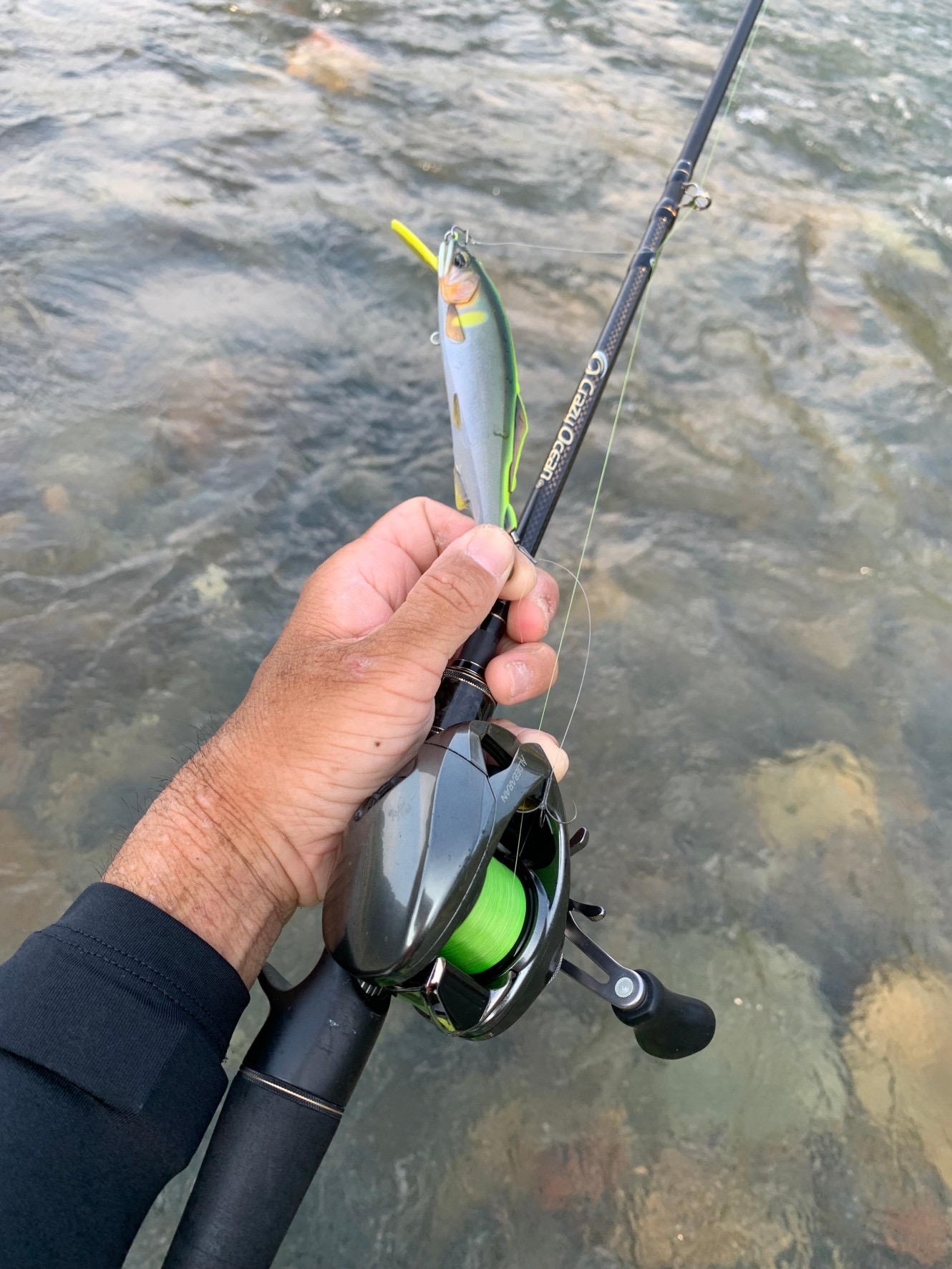 竿はクレイジーオーシャンのイカメタルロッド、リールは渓流ベイトフィネスのアルデバランBFSを使いましたよ。イカメタルロッドで問題なく使えました。ソリッドティップの方がルアーの泳ぎを把握しやすく、掛かる状態が判断しやすいのと、身切れ防止になっていると思います。まだまだ未知数のアユイング、奥が深そうでハマりそうです!