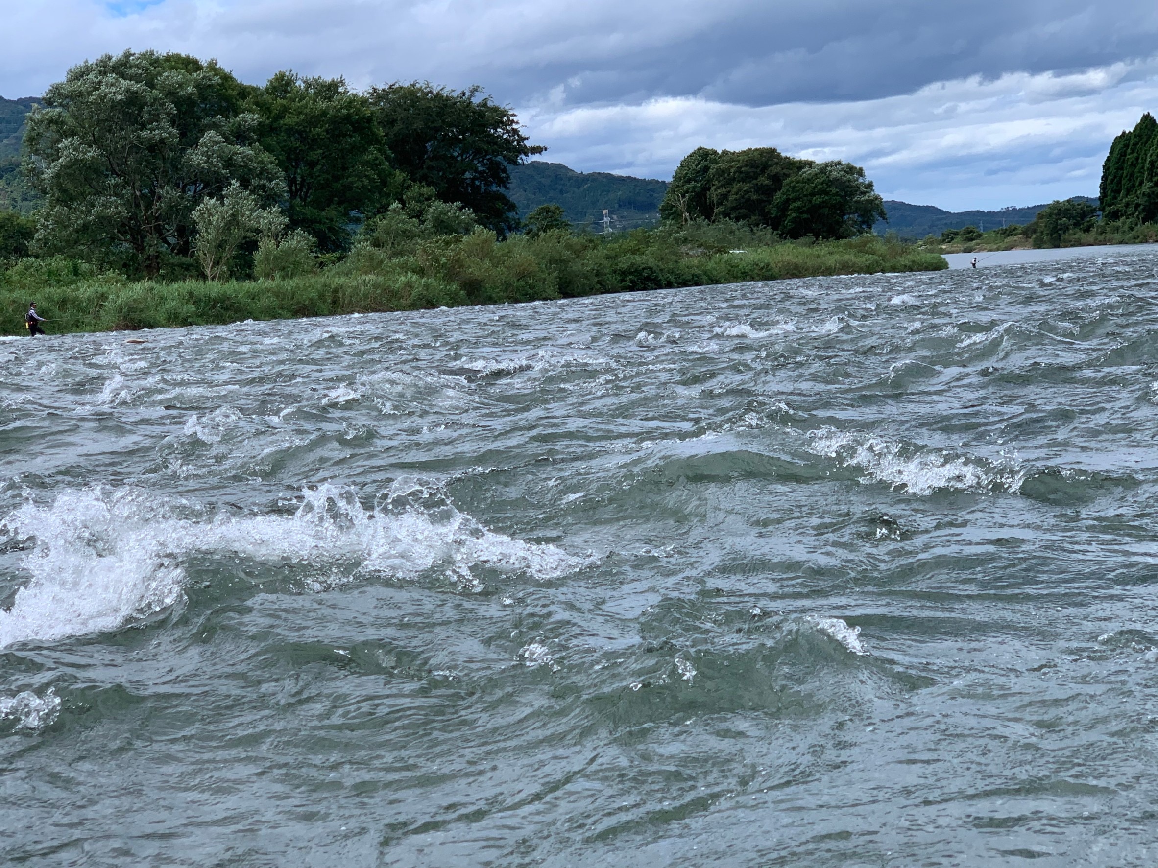 今年の九頭龍は天然遡上が多く鮎の数が多い!その分サイズは特大が育ちにくいですが楽しいですよ。坂東島から釜淵までの瀬を釣って行きます。竿はもちろんパワー胴調子のトリプルフォース急瀬90。押しの強い流れの中の鮎釣りは九頭龍の醍醐味でガツンと掛かると竿が満月に!しかし、キツイ瀬ではミス、トラブルがあるとオトリが循環出来ずに強風もあり降参。竿を先調子の短竿に持ち替え、チャラ瀬を泳がせると怒涛の入れ掛かりに!また元気おとりを深瀬に入れるとガツーンと持っていかれてますが先調子短竿のままでは太刀打ち不能!?