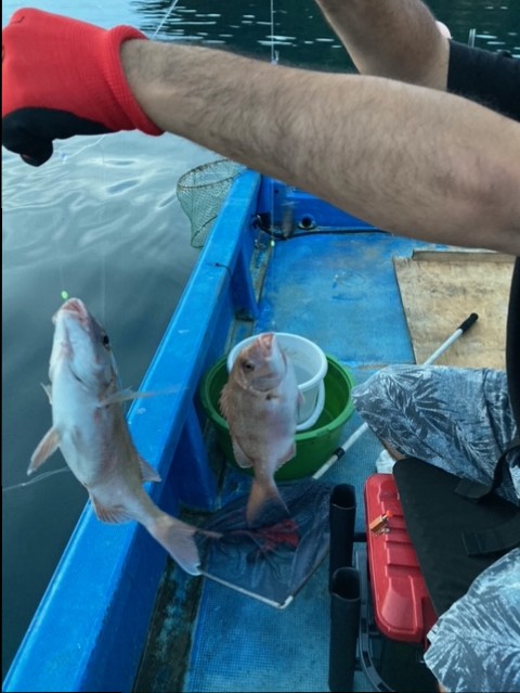 のんびり準備している間に同行者が早速HIT。しかも真鯛のダブルヒット。その後も30cm前後の真鯛をダブルヒット連発し、私が釣りを始めるころには既に6匹ほど釣れていました。