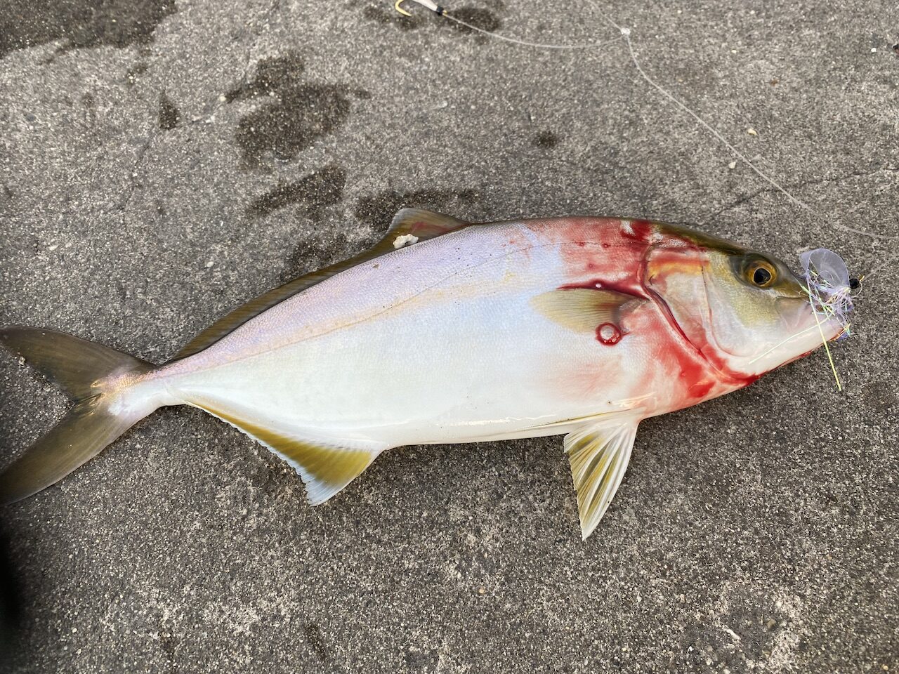 夜中に目が覚めたのでせっかくなので行こうと思っていたショアジギングに久々に行ってきました。色々な所をみてお客様の多かったポイントに行ってみることに。。。到着してしばらくは釣れてないような状況でしたが奥で一匹それっぽい魚が上がっているようです。遠くからだったのではっきりとはわかりませんがどうもブレードジグっぽいので釣られていたので私もメガバスさんのマキッパ40gに変更して、さらにサイズ的にジギングサビキが効くと踏んだのでハヤブサさんのジギングサビキをつけてキャスト!ボトムをとってただ巻きやワンピッチ、色々試してみます。スピードを落としてジグをフワリと誘ってから一瞬間を入れたタイミングでヒットしました♪かかっていたのは読み通りジグサビキの方に掛かっていました♪周りではジグにも掛かっていたのでどちらでも良さそうですね♪この日の時合は自分はこの一匹のみでしたが周りでもちらほら上がっていたのでまだまだ期待できると思います☆彡久々のショアからの青物が釣れたので個人的には非常に満足出来ました。