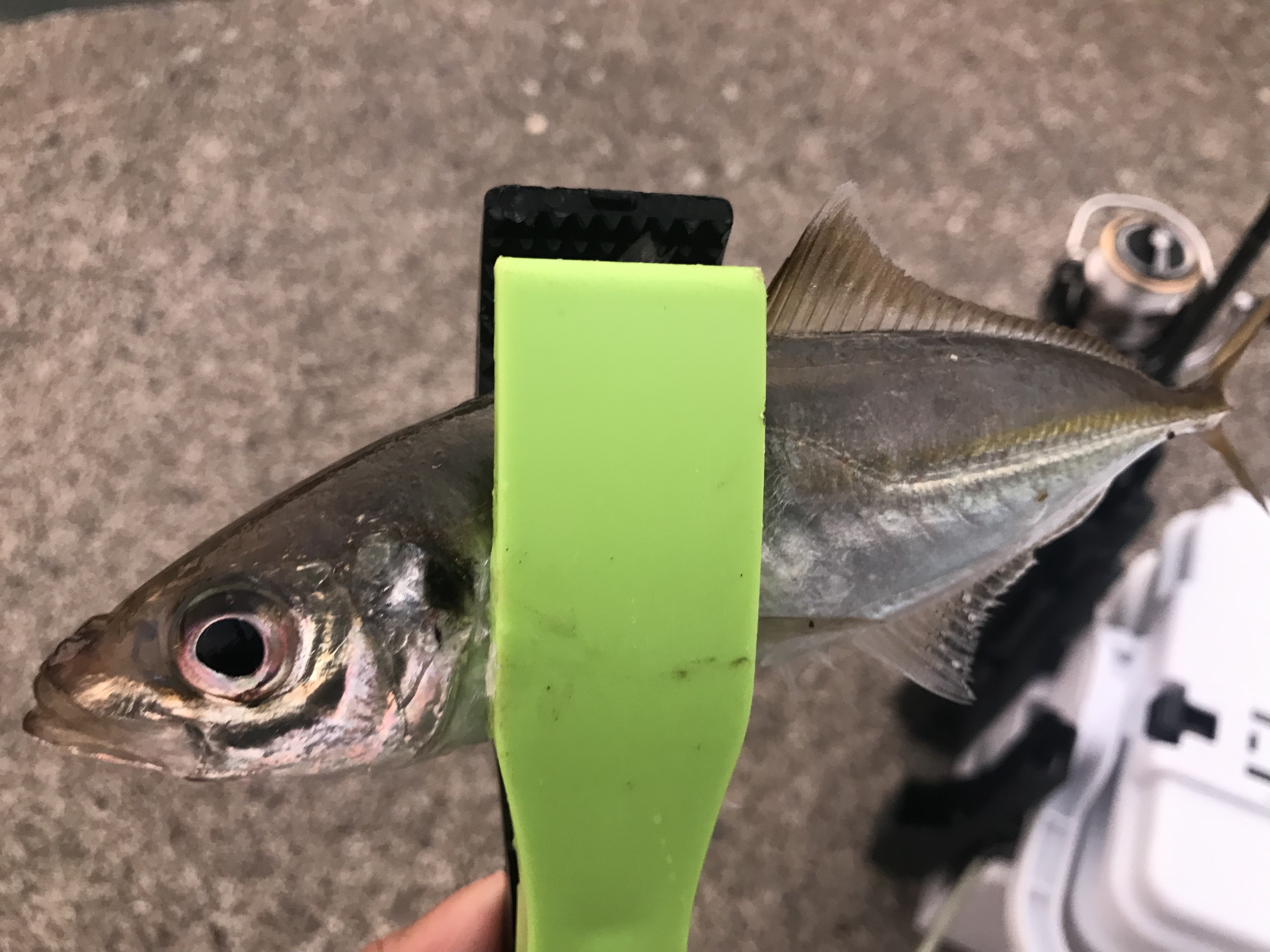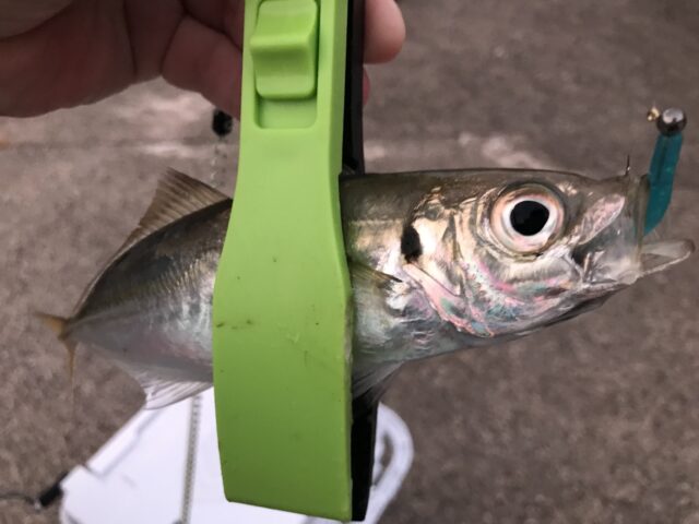 上がってきたのは20cm位のアジ!大っきいのいました!その後も同じパターンで釣れ続けて最終的には2時間で20cm前後のアジを3匹、豆アジ大漁でした!