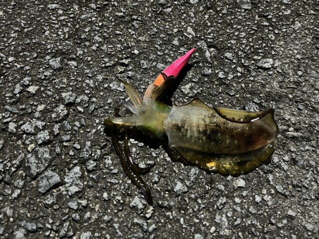 夜は赤テープか金テープが良いと言いますが、どちらも持っていないのでピンク下地のエギを使いましたが釣れました‼︎