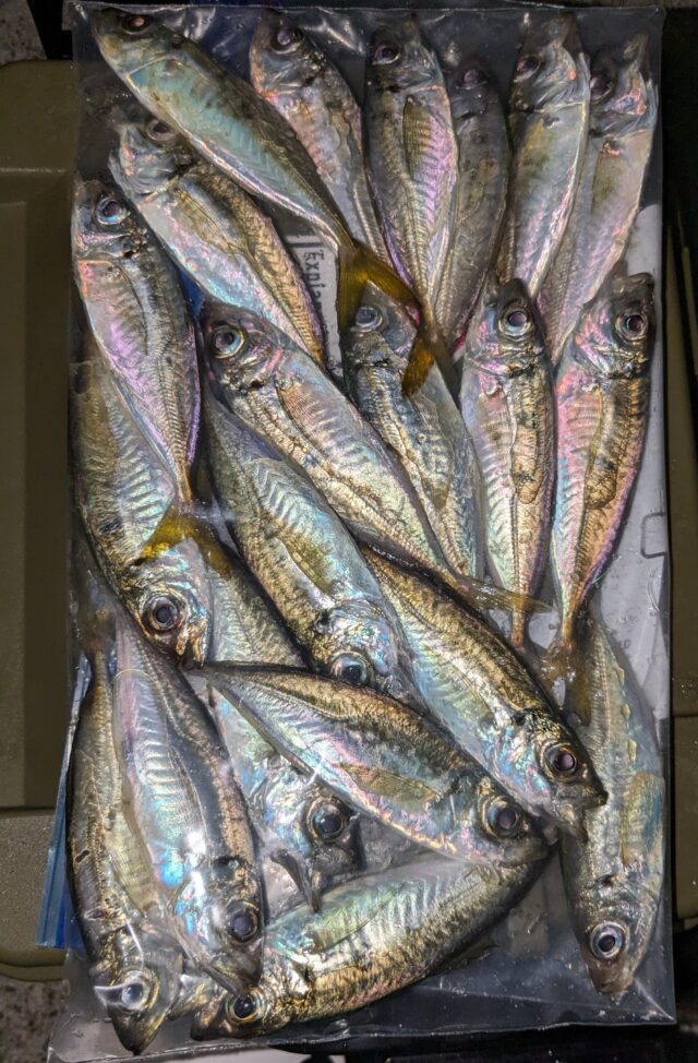 ポイントに着くなり、なにやら海が騒がしい雰囲気…海を覗き込むと、そこら中にタチウオやらダイナンウミヘビやらセイゴやらワチャワチャ🎉今日は雨上がりで大潮ということもあり活性が高い様子💡今回の仕掛けは、レベロクの豆アジヘッド0.7号#14にレインズのGSキリン、オキアミグローパワー、ERTELの桜吹雪を使いました!