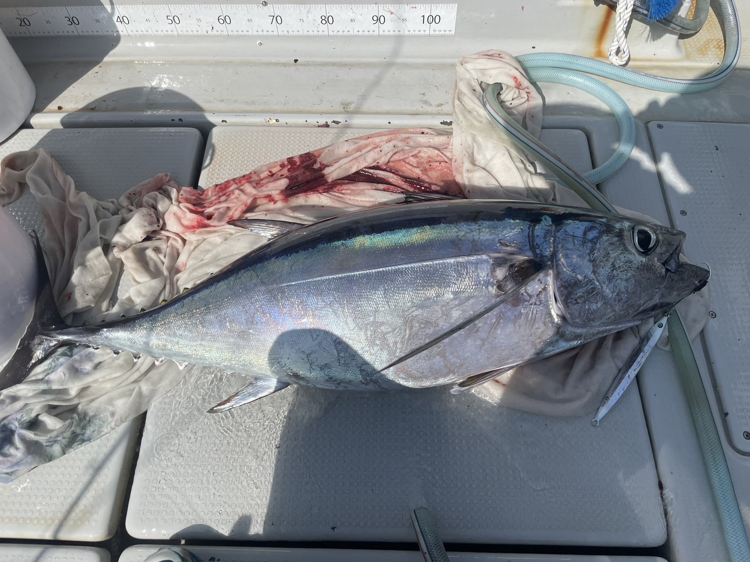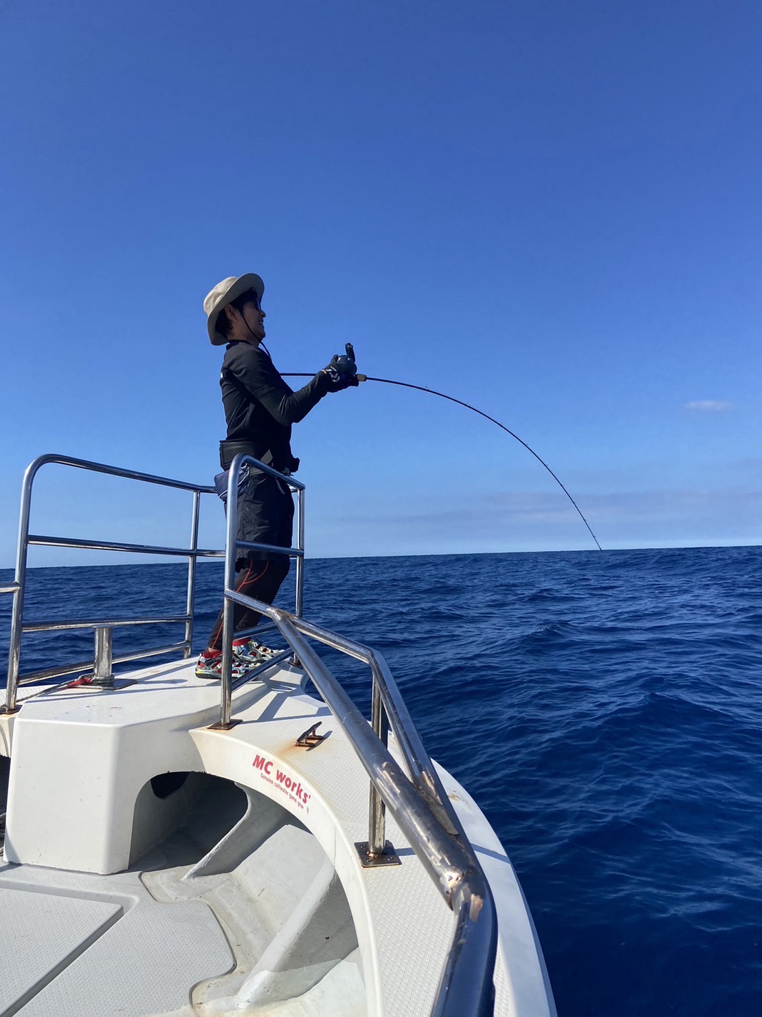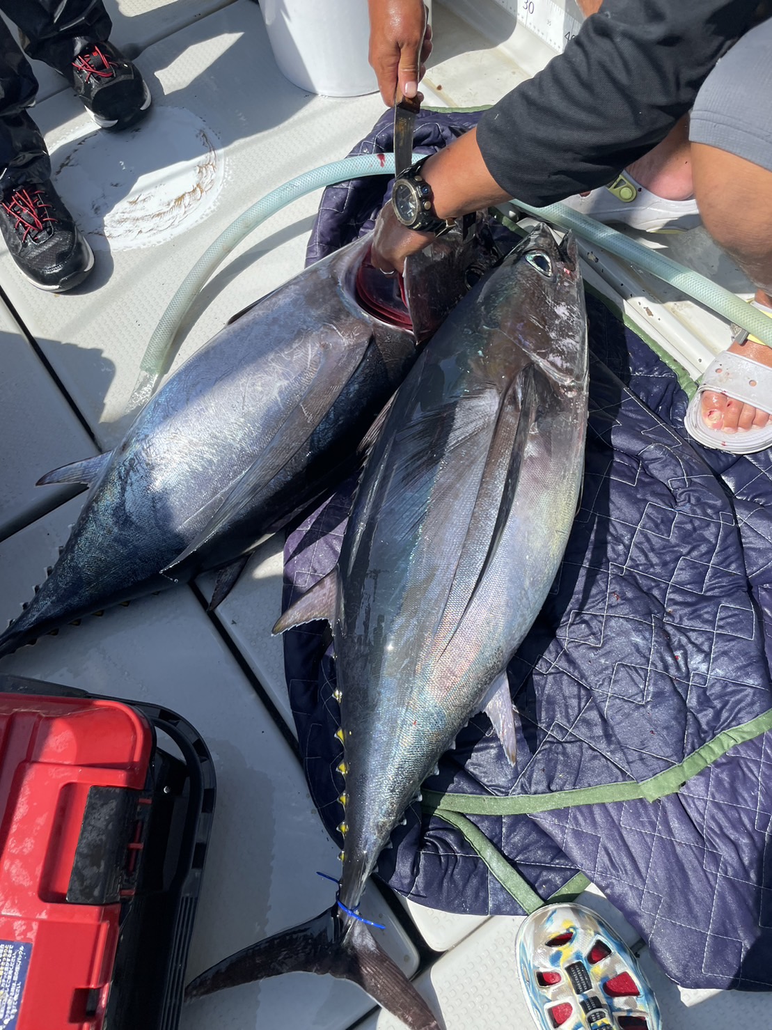 ジグの方が良さそうという船長の一言でジギングをやってみることに。ジグはクレイジーオーシャンのトンボジグ250g。まさかの1流し目でヒット。上がってきたのは20kgオーバーのビンチョウマグロ。その後もトリプルヒットなどもあり船中9本という上出来な結果でした。アベレージも15kg前後と大きかったです。PEラインは3号よりも4号の方が強引にやり取りできるのでこの時期は4号がオススメ!