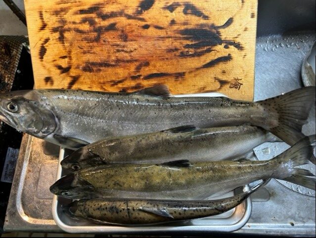 事前情報ではターンオーバーで濁りが入り、ウグイなどのエサ取りが増えてきた。と聞いていたものの、船長がポイント・ルアー・ドジャーといろいろなもののローテーションで、時に連続ヒットで船内バタバタになることも。この釣りはトローリングなので難しい操作などは無く、かかってからとにかくバラさないことが最重要。とにかく一定の速度で巻き続けるのがキモです。