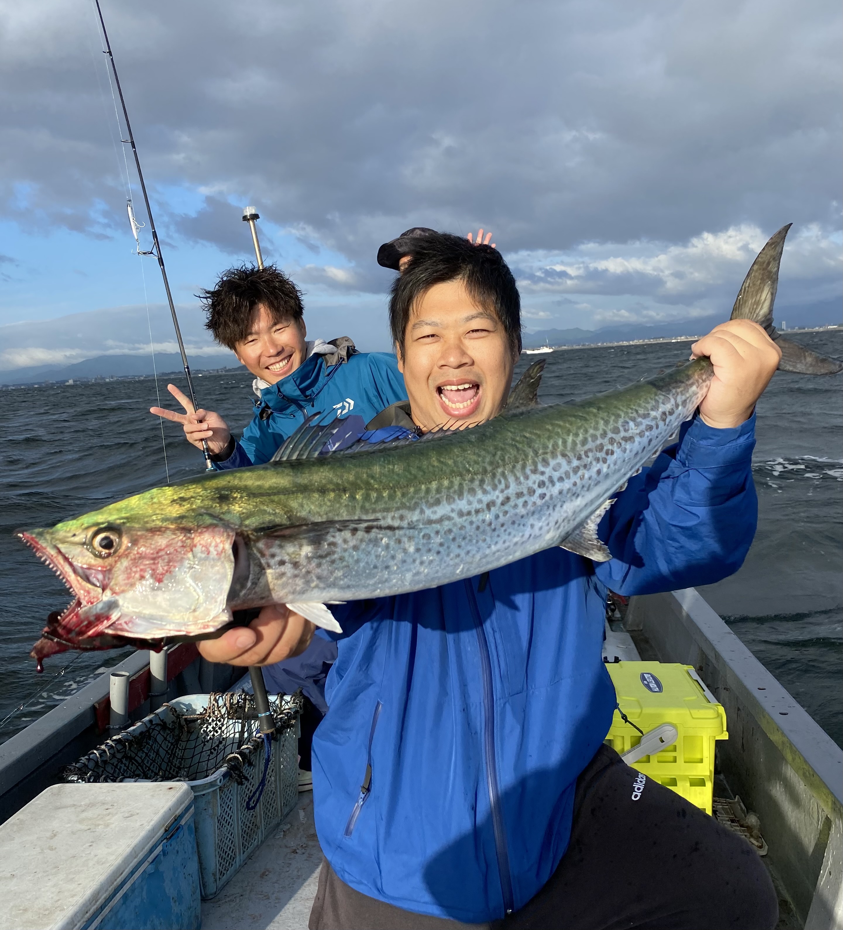 5時半に出船。ポイントは目の前の海。水深10mくらいの場所です。開始早々にサゴシがヒット!今年は本当に多いです!サゴシサゴシサゴシと釣ってると突然来ました!ドラグが出るやつが来ました。水面にギラッと大きいサワラ!ここで暴れるので冷静に回します。タモ入れ成功でメーターサワラを釣る事ができました!そしてすぐ帰港!流石スーパーショート便!オカッパリアングラーにもオススメです。ジアイだけ出来ます!
