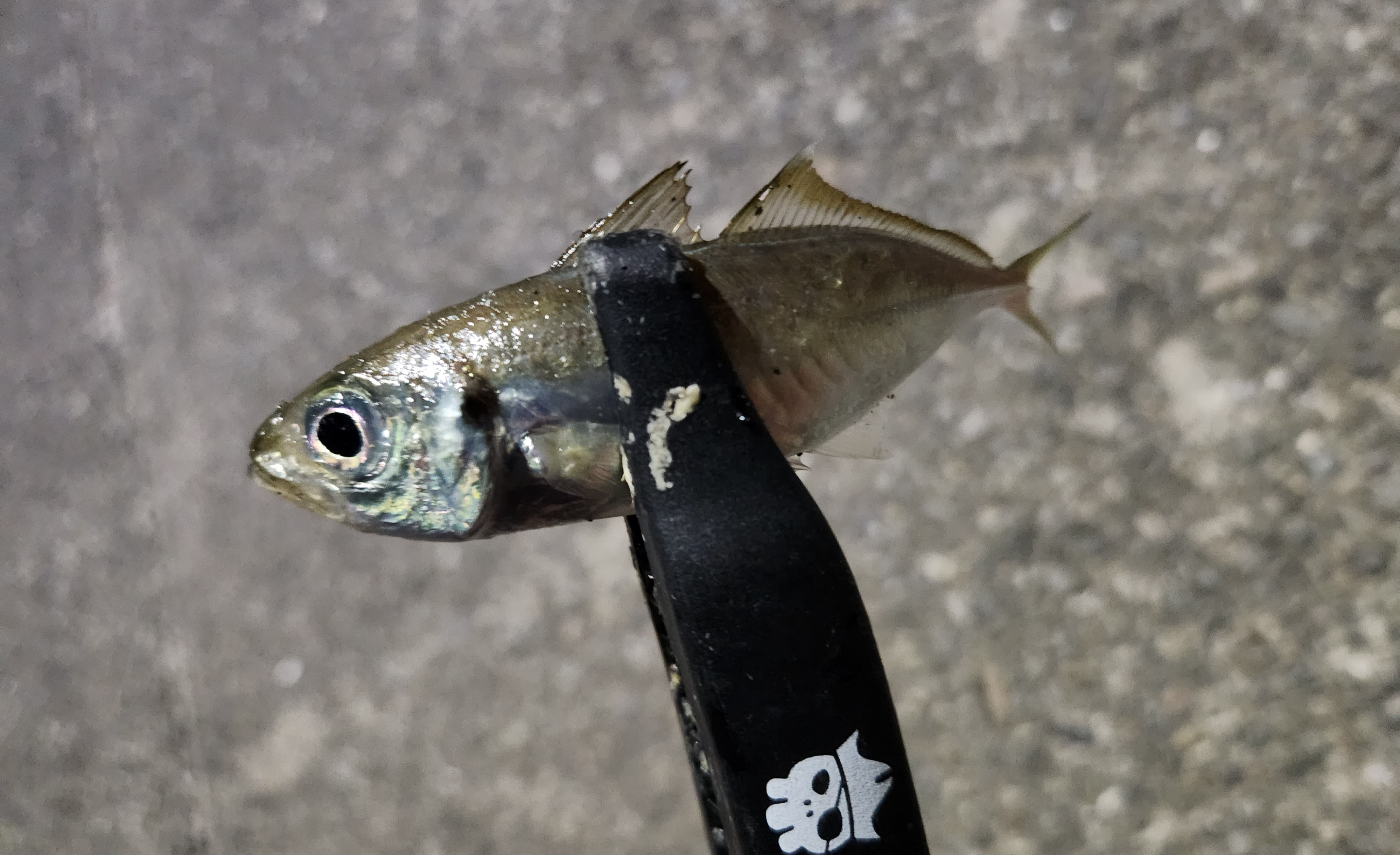 常夜灯周りでやってみると早速アタリあり、いつものマグバイトさん小悪魔ジグヘッドとレインさんアジアダー カラーはフィッシング遊オリカラ「ミスティア」で豆アジヒット!