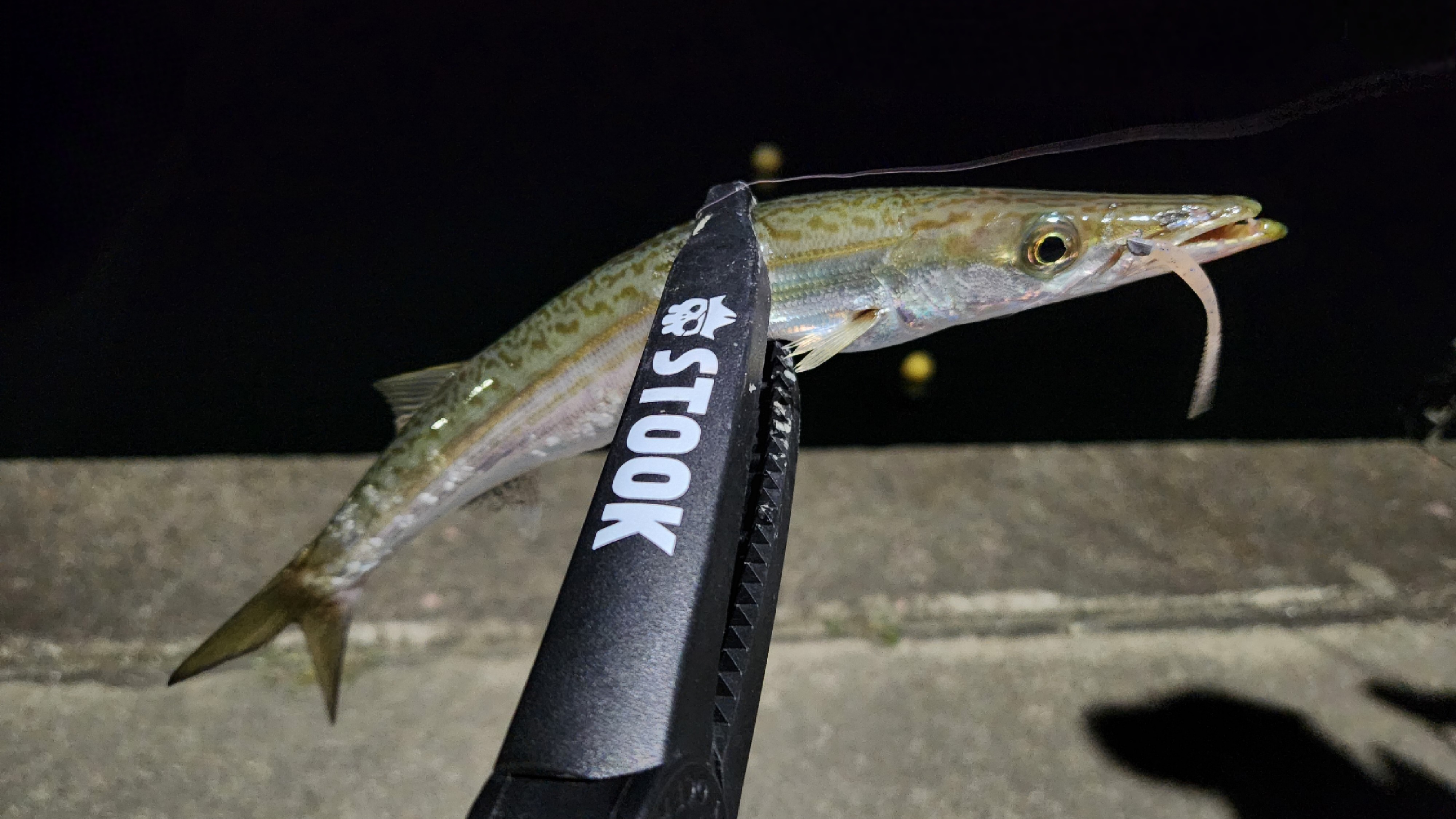 その後も場所とワームを変えて釣っていくと連発もありました。ネンブツダイも多いですが。レインさん チビキャロスワンプ 「オキアミアイス」でドラグが止まらない魚がヒット!時間をかけてあげてくるとおっきなカマスでした!30センチくらい!