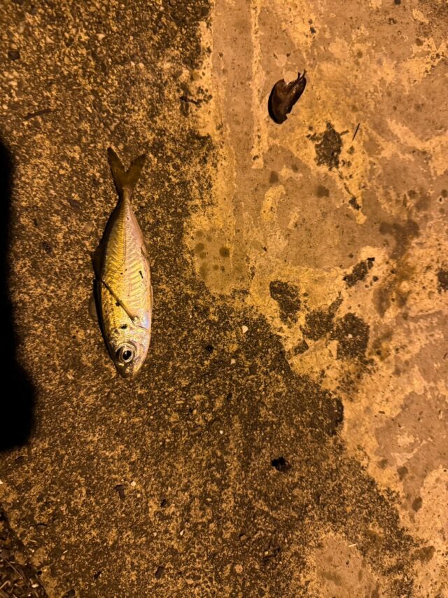 少しするとアジを狙いにシーバスが来ていたので泳がせてみるとヒット!しかし掛かりが浅くバラしてしまいました。