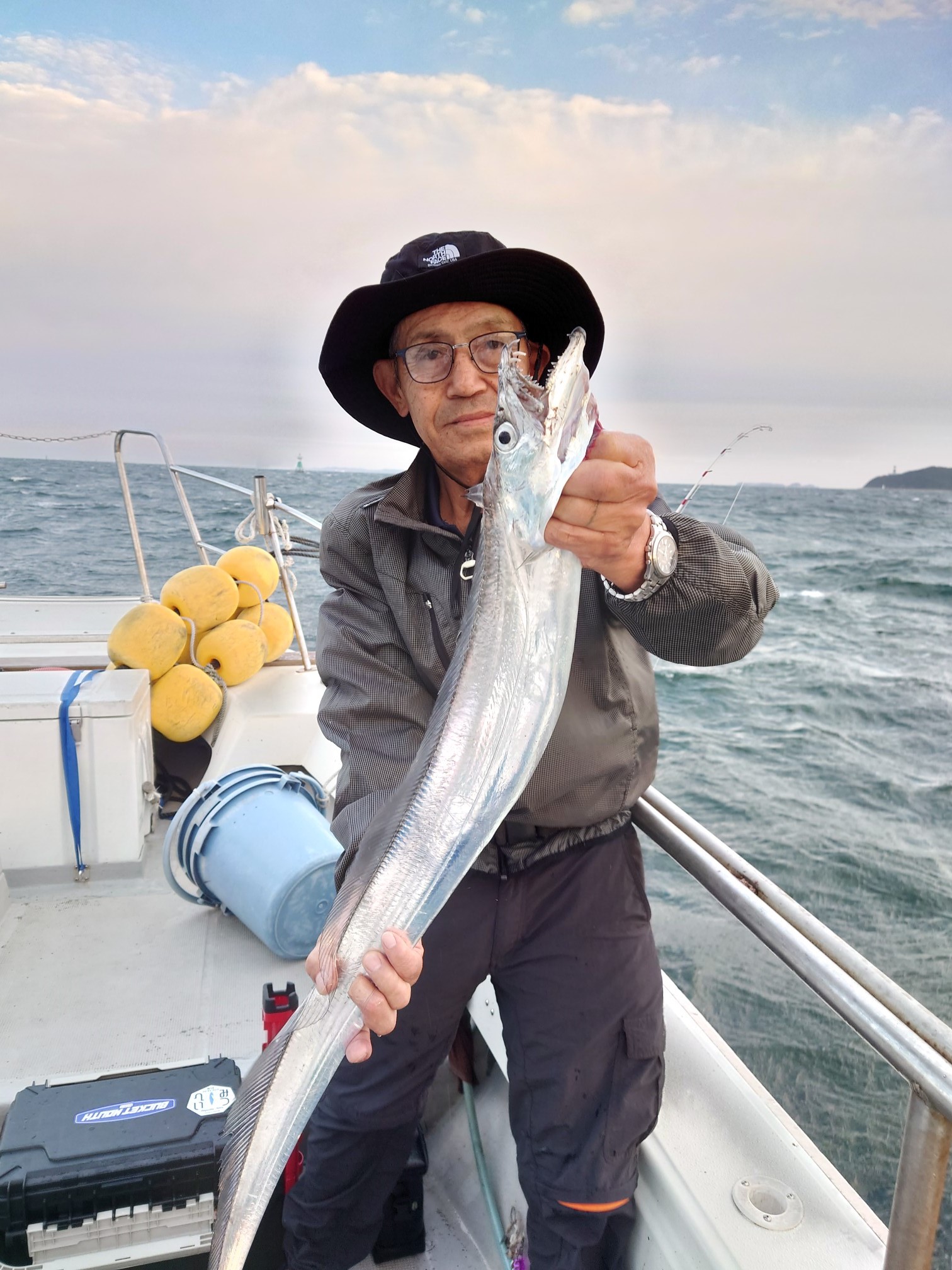鳥羽赤崎出船の菅島のKAIEIMARUさんにて太刀魚テンヤに釣行。氷は船にてもらえ帰港後にも追加で氷はもらえます。5時半頃出船してポイントまで30分くらいで北西風強く波高。50号のテンヤを使用、エサはイワシ、アジ、まどを計30位準備。船長のアドバイスはF3本前後の小型が多数いる中で大型狙うなら(派手なアクションしない)目立たせないこと、明確な大きいアタリのみ合わせるで、電動で微速2~3までのただ巻きで狙います。水深80m前後、50~60mで魚群、底取りせずに50~60mまで落としただ巻き。40~50mのタナでは型が良くF5.5が釣れる。エサにアジの干物を使用してみたが、とにかくエサ持ちがよく数釣りにはもってこいでした。同じエサで連続5本くらいまで釣れました。現在もコンスタントに大型太刀魚が狙えます。船長によると11月下旬くらいまで行けるとの事。色々なアタリ方や合わせ、エサの工夫など楽しさ盛りだくさんのこの釣りは中毒です。