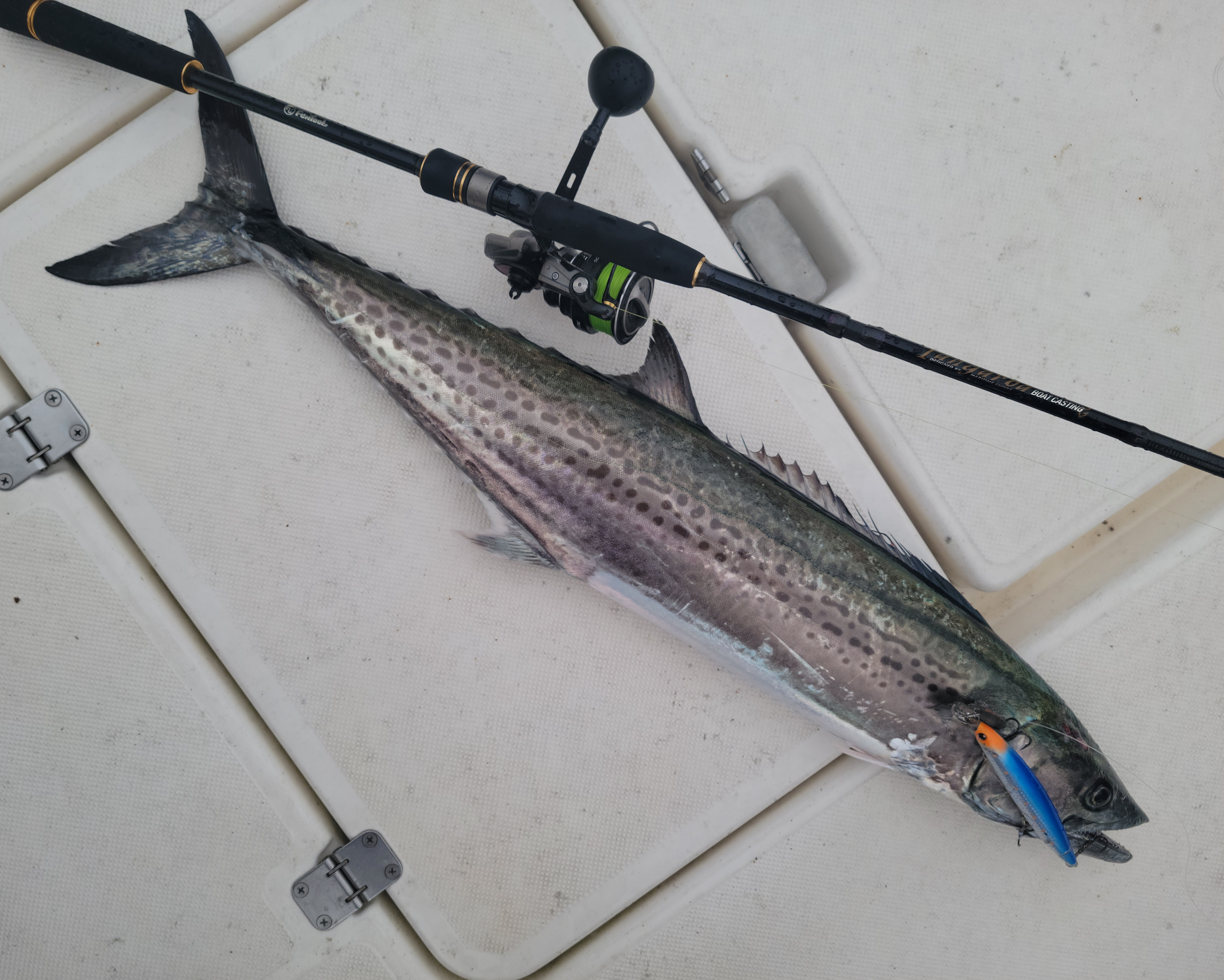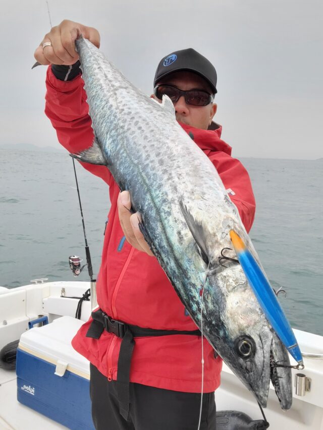 サワラの釣果が上向きになってきたのでマイボートで釣行してきました。河芸沖まで行こうと思いましたが風の予報もあったためこの日は石鏡方面に走りました。下げ潮の間はティップランで狙いますが直ぐに潮止まりで船が流れず釣果無し… 上げ潮に変わった途端にナブラが出始めてツバスのオンパレード!!しばらく楽しんだ後に沖にサワラナブラ発見で急行して何とか2本のサワラをゲットできました。当日は私が信頼するダイワ バーティス140fのフィッシュハンター様遊オリカラでゲット!湾内もサワラ沢山入っておりまだまだこれからが本格シーズンですのでまた釣行してきます。