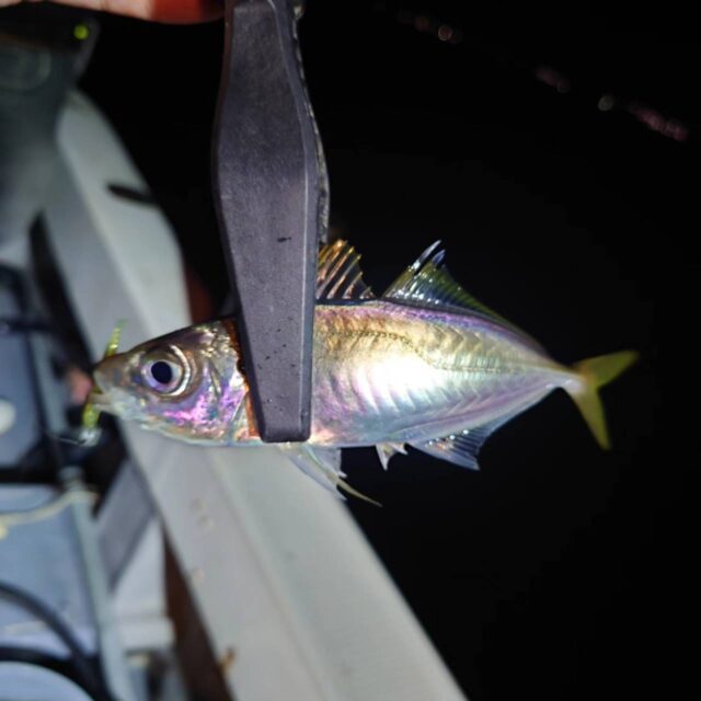 10月13日静岡県、清水港出船の千秋丸様にお世話になり、ナイトボートアジングに行ってきました。普段、0.2g~0.6gのジグヘッドで悶絶アジングをしているので、今回はまったく毛色の違うアジングという事でお勉強。釣場は港からすぐのポイントからスタート、水深は10m前後、ジグヘッドは1.5g~2gでしっかり底を取れました。まずは、底から狙いますがアタリなし、ポイントを移動して再び底を狙うときれいなアタリ!これはフッキングミス。同じパターンで底から狙うと再びアタリ、今度はしっかりフッキング!20cmのアジを久しぶりに見ました。その後移動したポイントでは底まで沈めるとタチウオにジグヘッドを取られるので、表層から攻めてみることに。フルキャストして明暗を通すとガツンと良いアタリ、25cmの良型ゲット!その後懲りずに沈めてタチウオをジグヘッドで釣り上げていました。指3本まで上がりました。ジグヘッドはTGの1.5~2.0gがオススメ、タチウオにやられるので多めに準備していくことをお勧めします。ワームは今回もレインズチビキャロスワンプオリカラ、ホーミーセゾンを使用。初ボートながら、何とか2桁釣果を上げることが出来ました。先生は20匹以上釣ってました。流石です!