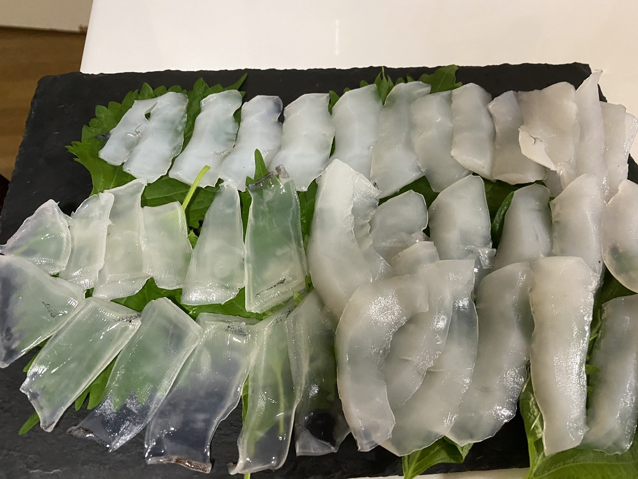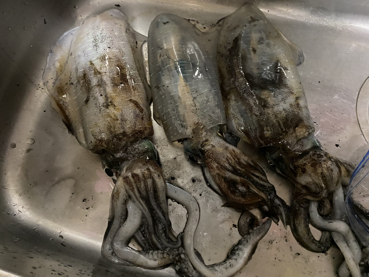 春のティップランで南伊勢に行ったときは完全試合を食らった私でしたが、今日は事前の準備や予習なども済ませてリベンジマッチ!南伊勢の相賀浦のなぎさ丸さんにお世話になりました。この日は風が吹いなかったので渋いとのことでしたが、朝一の浅めのポイントから反応が返ってきます♪最初に使用したエギはクレイジーオーシャンのティップランナー3.0号をチョイス♪カラーはアジパープルでやりました。底をしっかりとってから7~8回位シャクって穂先を見ているとニューっと動いてくれたのですかさずアワセ♪一発目から乗せることができました♪最初のポイントはコロッケサイズ位でした。ポイントを少しずらしたタイミングで今度はパープルパープルに変更、底を取って最初のシャクリをいれて穂先に全集中!小さなアタリでしたが見逃さずとることができました♪この後はポイントを大幅に変えて水深30m前後がメインのポイントに行きました。水深が深めの方がイカのサイズも大きくなるのでエギのサイズは3.5号に変更します。アタりのタイミングは様々でしたがやる気のあるイカは最初のシャクリでエギを追ってくれている感じを強く感じました。風も吹いていなかったのでこまめにエギを回収→再投入を繰り返しました。アタリが止まったタイミングで船長が立て続けにイカをあげられていました。カラー化と思いみているとアジ金系のカラーだったので自分もアジ系のカラーに変更しました。変更した一発目で500gくらいのサイズが来て切れました。ここからは金アジ系のカラーが有効だったのでねちねちやっていると600~700gくらいのサイズを2杯追加することができました。小さいイカは味噌ダレ系の液体に漬け込んで沖漬けに、それ以外は刺身と醤油漬け丼とアヒージョにしておいしくいただきました♪身も透き通っているので見た目もきれいですね♪今年は本当にイカのアタリ年なので新鮮なイカをい求めてぜひ行ってみてくださいね♪