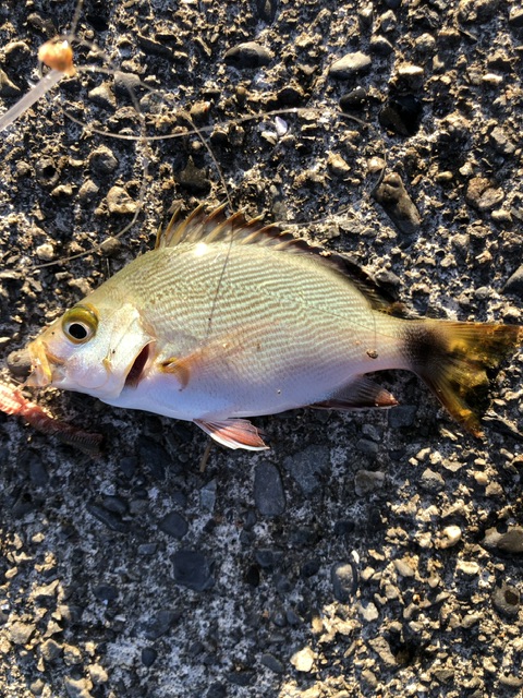 少し投げ待つと当たりが…フグ!次はベラ…(;_;)今度は投げずに足元に…落として直ぐにググーと持ってかれたので上げると手のひらより少し大きい位のイシガキダイが(゚∀゚ノノ”同じようにまた落とし当たりを待つと黄色の可愛い魚が釣れました((o(。・ω・。)o))