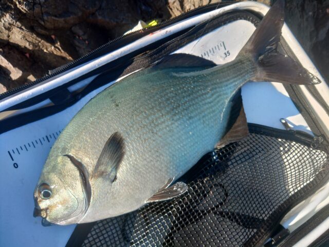 二人で西磯の角石に渡してもらい、私は沖側の先端で釣り開始!マキエを撒くと良型の魚がよく浮いてきます!大体イスズミのようですが、尾長も混じっているのを期待して投入!!ギュンギュンに引いてぶっちぎっていくイスズミ!!目が良いので毎投当たるわけではありませんが、表層で当たらず沈めて行ってもサシエ丸残りの厳しい状況…朝一少し潮流れてなんとか尾長グレ35㎝までを何尾かキャッチできましたが、その後はあまり動かず、グレの活性はかなり低い状況でした。夕方の一発を期待しましたがムロアジの活性が良くなり、そのまま終了となりました。