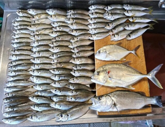 休憩して夕暮れ前から投げ始めるとすぐにアタリが出てアジが釣れる。サイズも20㌢交じりでポツポツ追加しては少しづつ動いてアジを確保していきます。暗くなりかけた辺りからパタパタっと釣れ出すがすぐに失速— こうなるとランガンスタイルでいくしかなく移動しながらアジを探し7時半に休憩してこの時点で42匹、そこから昨夜良かった場所に向かうと先行者が居て移動する。それが良かったのか次に入った場所で群れを見つけ連発に持ち込んで数を稼ぎます。アタリが出なくなりラストの移動で昨夜良くなかった場所でアジを見つける、今回はアジの居場所を見つけるだけで一苦労・・・帰りの運転もあるので10分休憩が1時間~ 結局そのまま終了して夜中の2時半に帰路に着きました。全体でアジは209匹ヒラセイゴ1にメッキ2でした。