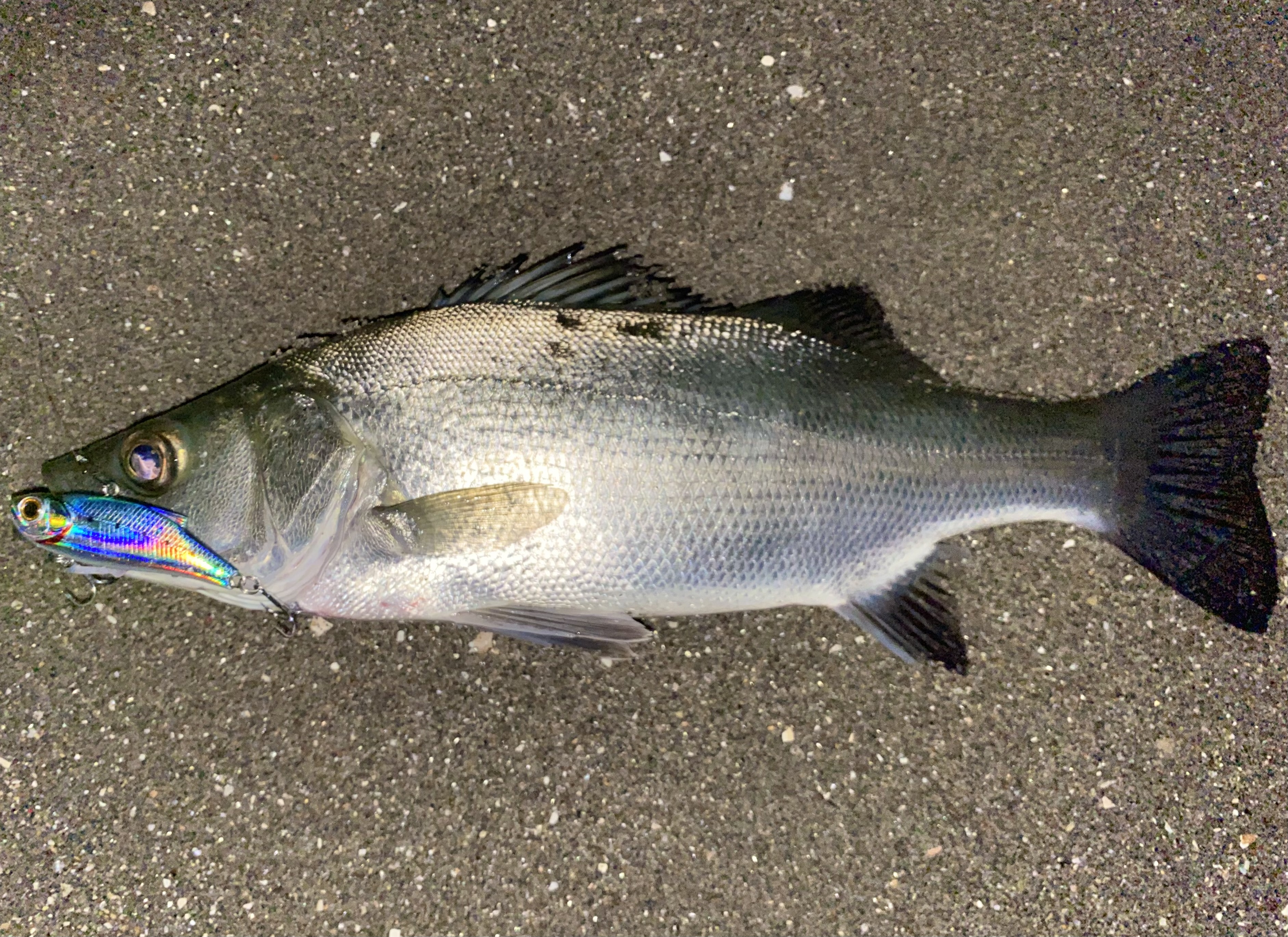 流れがきつく魚のいるレンジに届いていない感じだったので奇跡的に持ってきていたレンジバイブ55にチェンジ。ストラクチャーの際に落として巻かずにブレイク周辺に流し込んでいくと一撃でヒット!40㎝クラスのヒラセイゴをキャッチ。