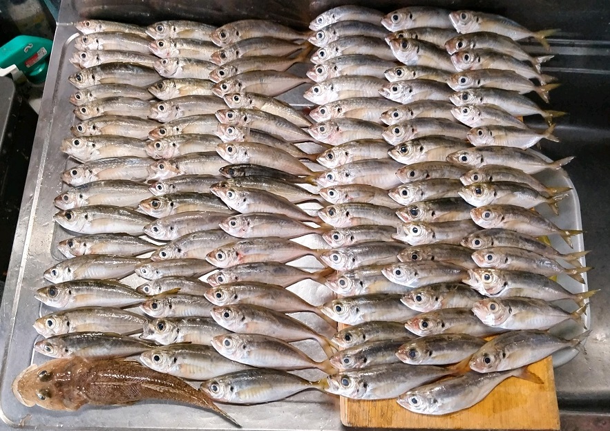 二晩目は暴風雨でしたが4時過ぎから開始しますが前日より釣りにくい、しかし1投目でアジが釣れ1投置きにアジが釣れますが雨風がだんだん強くなり超絶暴風雨へ、それでもアタリが出るのでアジを追加しながら移動していきます。風が巻くので右から左から正面からと安定ないないが何とかアジは釣れるので夜7時を過ぎた頃から前線が抜けたのか風が収まって来て時折雨が降る程度へ、そのタイミングで遠投で釣れる場所へ移動すると1投目から派手なアタリでアジが釣れます。ポツポツ追加しながら少しづつ動きますがアタリが出なくなり風が収まってからのがアジの活性が落ちて拾い釣りになってしまいました。12時前に終了して下道で帰って来ました。二晩目は98匹と前日より数が減ってしまいましたが あれだけの天候で釣れたのでイイ方ではないでしょうか。