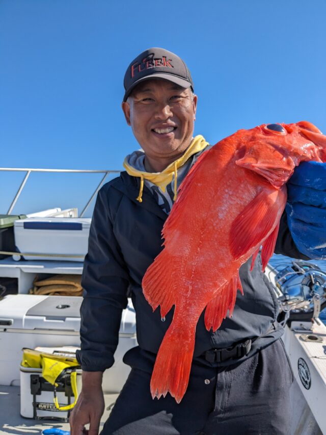 今回熊野の「正丸」さんにお世話になり深海の魚「アコウダイ」釣りにチャレンジしてきました。正丸さんではレンタルタックルも充実しており最新の深海釣りのタックルが借りられます。私も今回はレンタルタックルでチャレンジ。以前行った時にニッコーのイカタンを付けた方が良くヒットしたので今回も3色程用意していきレンタルタックルと共についている仕掛にセットした。今回使用した仕掛は幹糸30号ハリス20号の10本鈎。深海釣り初心者にはこのくらいの鈎数くらいが手返しがよく投入時のトラブルが無く丁度良い。オモリは鉄筋2kgで手返し用に船べりにマグネットも装備されいます。ポイントに到着後船長の合図で一人一人順番に投入していく。水深は500mから600m。夢とロマンしかない水深です(笑) 投入前後というか常に船長が適切なアドバイスをアナウンスしてくれるので無事600m超の海底に仕掛が届き私の竿にもアタリが出てワクワクで上げてくると1匹だけですが付いていました。この水深になると1日に10投もできないせいか時間がすぎるのもあっと言う間に感じます。この日は潮も緩く釣り自体はしやすかったのですが如何せん鈎掛かりが悪く釣果はアコウダイ2匹だけで終了となりました。また、鈎を切られた奴もいたのでまたチャレンジしたいと思います。