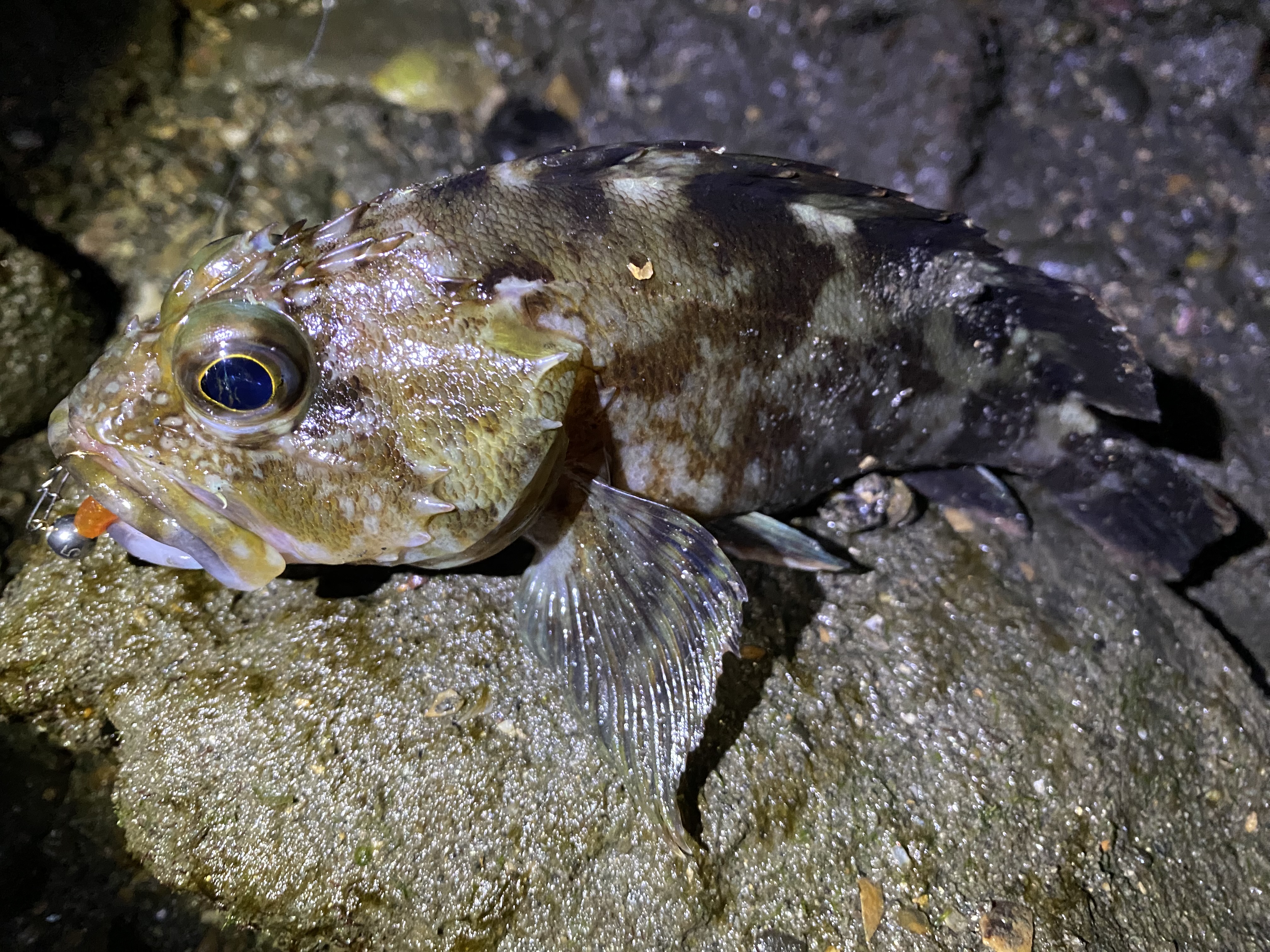 水位が下がってきたタイミングでカサゴ狙いへ。タングステンのジグヘッド1.5gにレーシングチビキャロスワンプを付けて手前のブレイクに沿って巻いてくるとカサゴ連発♪20㎝頭に数匹キャッチして帰路に着きました。
