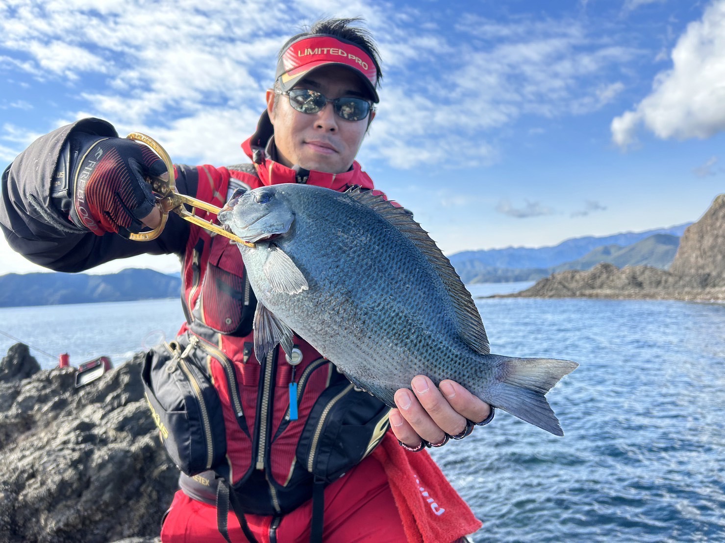他店メンバーと磯釣り合宿に行ってきました。初日は白浦の世古渡船様にお世話になり黒岩のハナレに渡礁しました。表向きに釣り座を構え実釣開始です。3ヒロからスタートし、しばらくしたら気持ちいいウキの消込み!30㎝程のクチブトです。その後も同じサイズをもう1枚釣りました。四日市店の小出さんは青物やら尾長やらを竿を曲げて楽しそうに釣っていました。私は少々トラブルがあり時合いを逃すハメに…しばらく沈黙が続きましたが全誘導釣法で何とか34㎝のグレをゲット!その後はアタリが無く沈黙状態でしたが全誘導をやめてタナを深く設定し潮に流すと1発で来ました!45.5㎝のクチブトです。よく引いて楽しいです。オオモンハタやブダイも釣れ最後はクーラー満タンになりました!皆さんも是非行ってみて下さい!