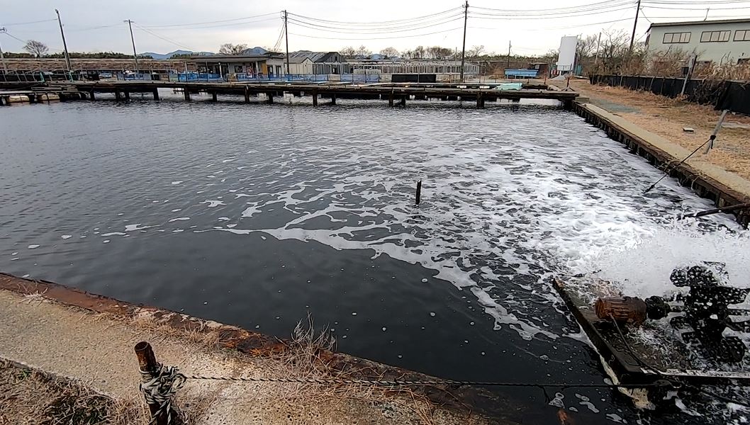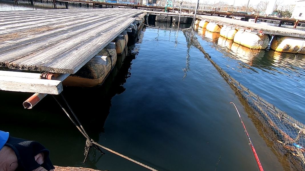 しかし今回は天候も良く太陽の日差しも温かいので少し期待が高まります。タックルは自作の筏竿に下向きリール、フロロカーボン1.7号をセットチヌ針3号と小針にしてみます。エサはモエビ・キビナゴ・ギンペイの3種類で勝負です。ネットの際、壁際と攻め、水車の周りと攻めますが・・・・。