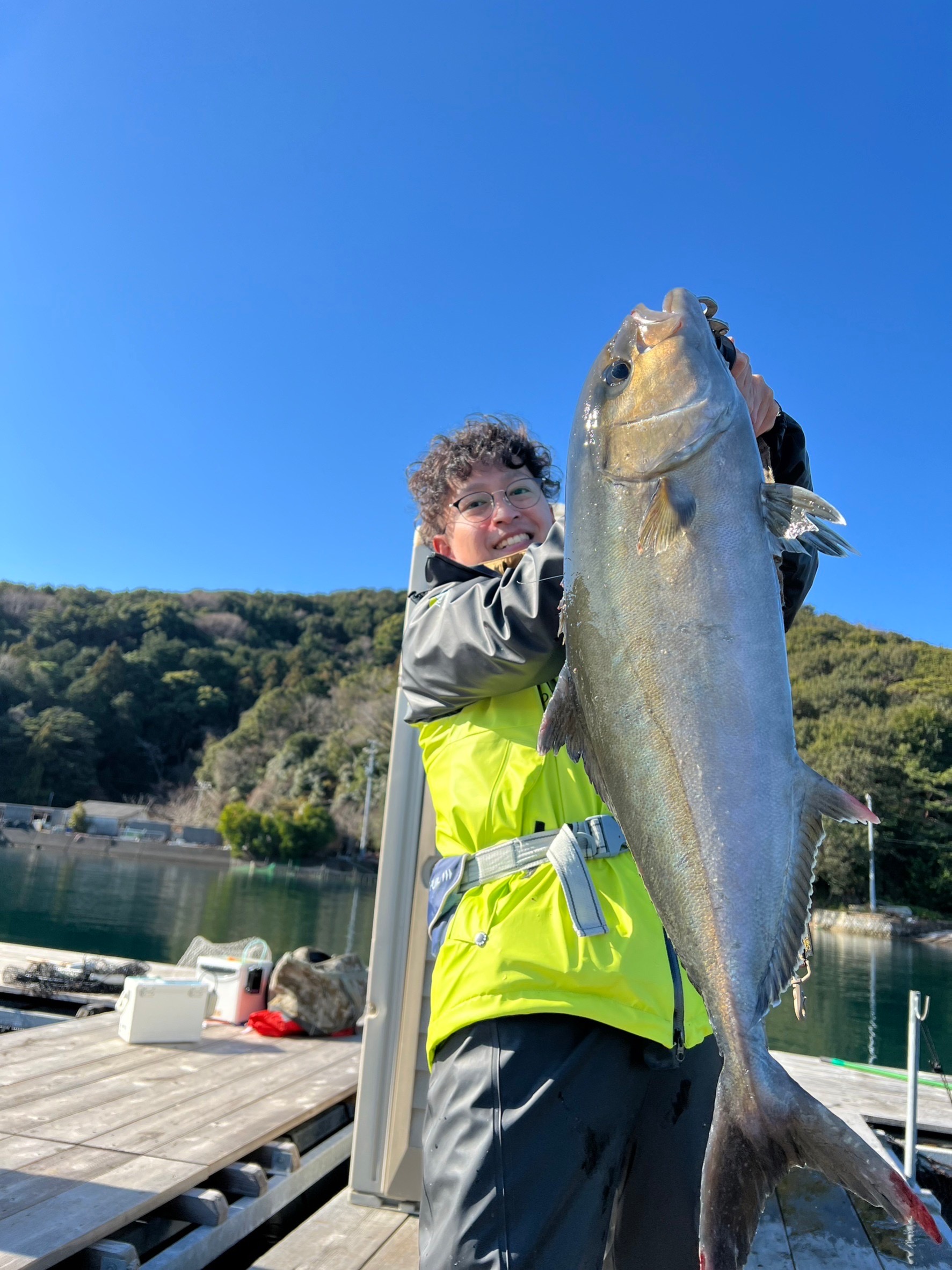 9時頃を境にパッタリとアタリが無くなったため放流に合わせて泳がせたりの準備。ウキ仕掛けにアジを背掛けにして泳がせているとヒット。70cmほどの放流したてのカンパチでした!