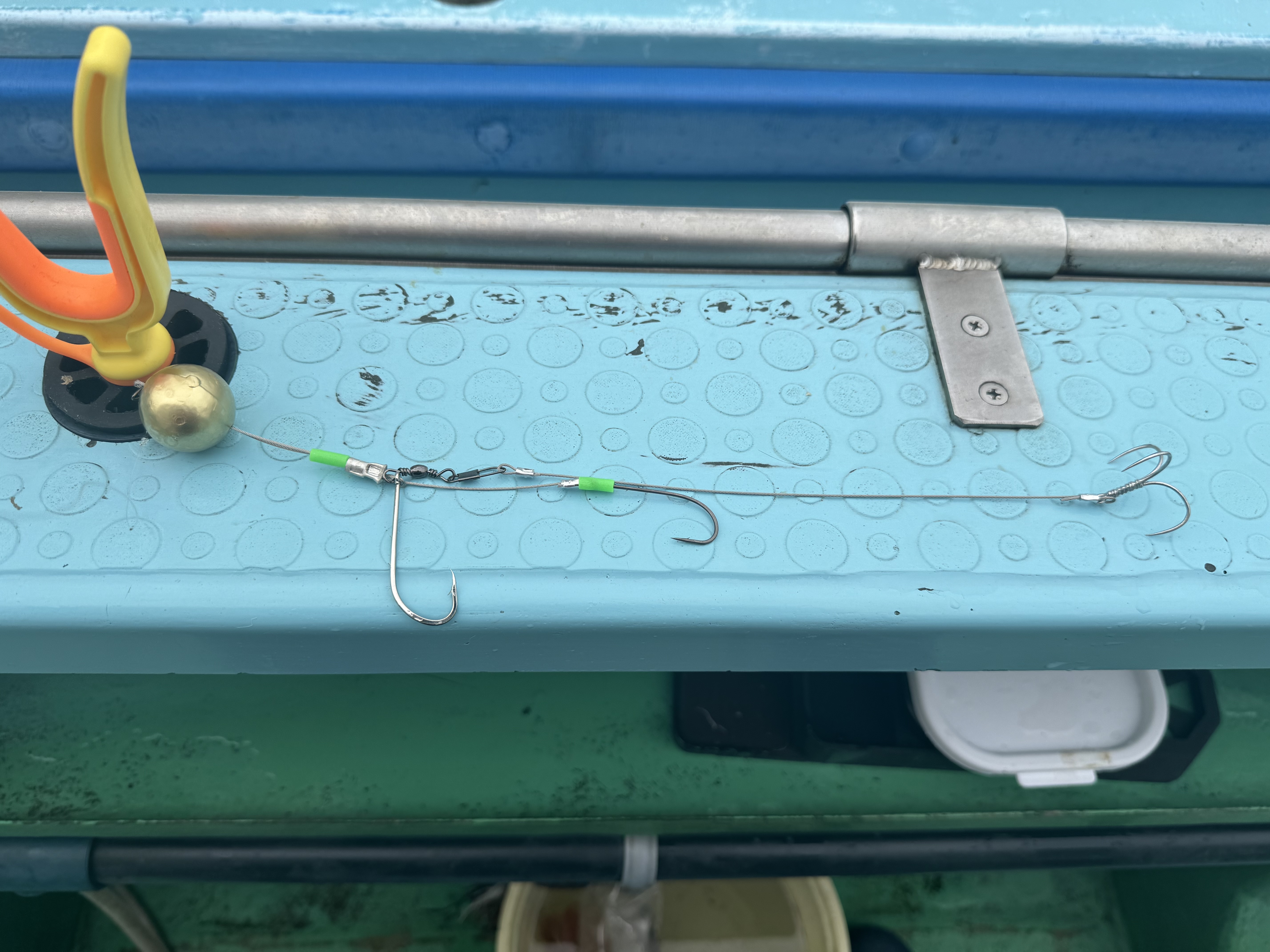 初めてやるので仕掛けは船宿仕掛け、いわゆる「カットウ仕掛け」をワイヤー仕様にしたもの。特にXデーを越えて寒い時はカットウ針をとって餌つけバリに直接かけるそうです。水深は70メートル〜100メートル、棚は2メートルまで探るとの指示でした。