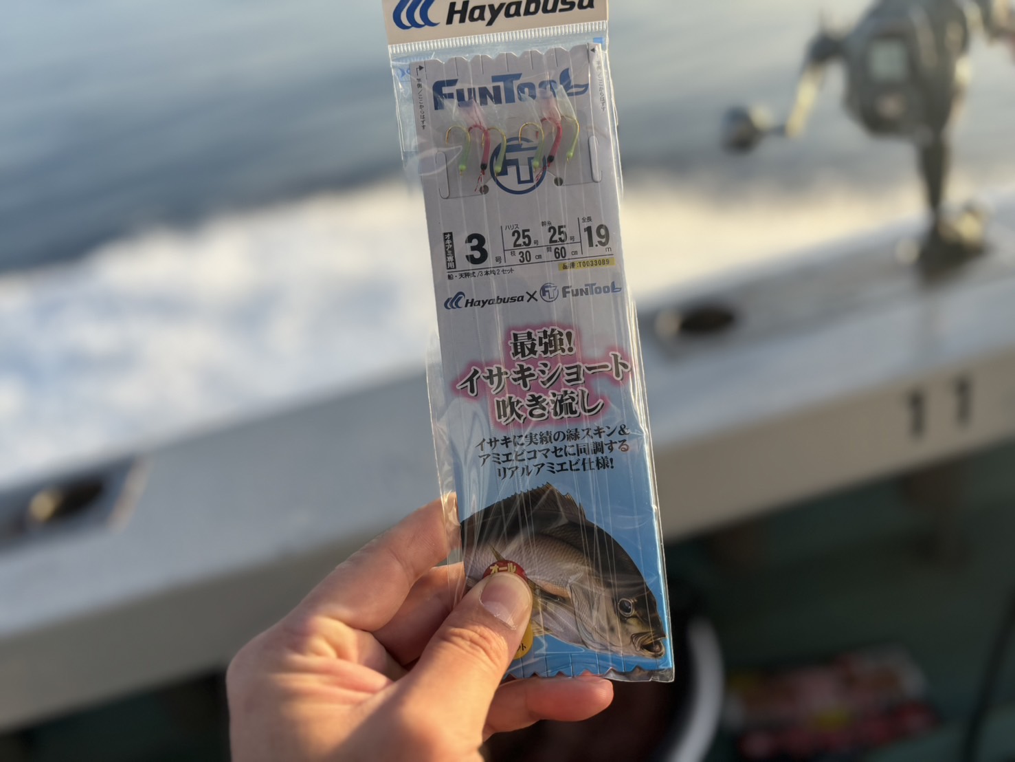 今が旬!大進丸様で激ウマ!イサキを釣りに行って来ました。4時30分出船し大山沖まで約1時間30分の船旅です。ポイントに到着しさっそく釣り開始!仕掛けはFunTooLの最強!イサキショート吹き流し1.9mを使用。オモリ80号です。指示ダナにコマセが効くように竿を振って仕掛けと同調させます。うまく仕掛けが馴染むとイサキ特有のアタリが♪慎重にあげてきて激ウマイサキをゲット!途中時合がありましたが私はリズムに乗れず数を伸ばすことができませんでした。後半はポイント大きく変えアジ狙いに!これが私の仕掛けにハマリ入れ食いに!ジャンボアジでこれもまた激ウマ!イサキ×3 アジ×12 と満足の釣果でした。おまつりも多いので仕掛けは沢山(4枚~5枚)持って行く事をおすすめします。