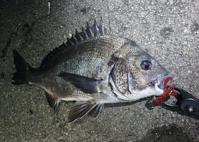 そこからアタリなくなってしまいました。すると「ここならアタリますよ」と場所を譲っていただき、投げるとアタる!しかしもっていかず。もう一回投げるとまたアタリ、今度はしっかりもっていったので合わせるとヒット!40センチくらいのチヌを釣らせてもらいました。