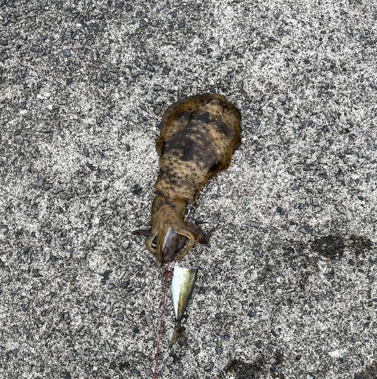 ここで20センチ近いアジが連発!その最中に、泳がせていたアジにアオリイカがヒット!