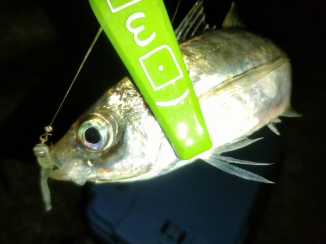 開始数投、カウント7で幸先よくあたり22cmのアジをキャッチ♪その後も当たりますが、乗らないアタリやキリッとしたアタリが出ないのでジグヘッドを1gに変更。