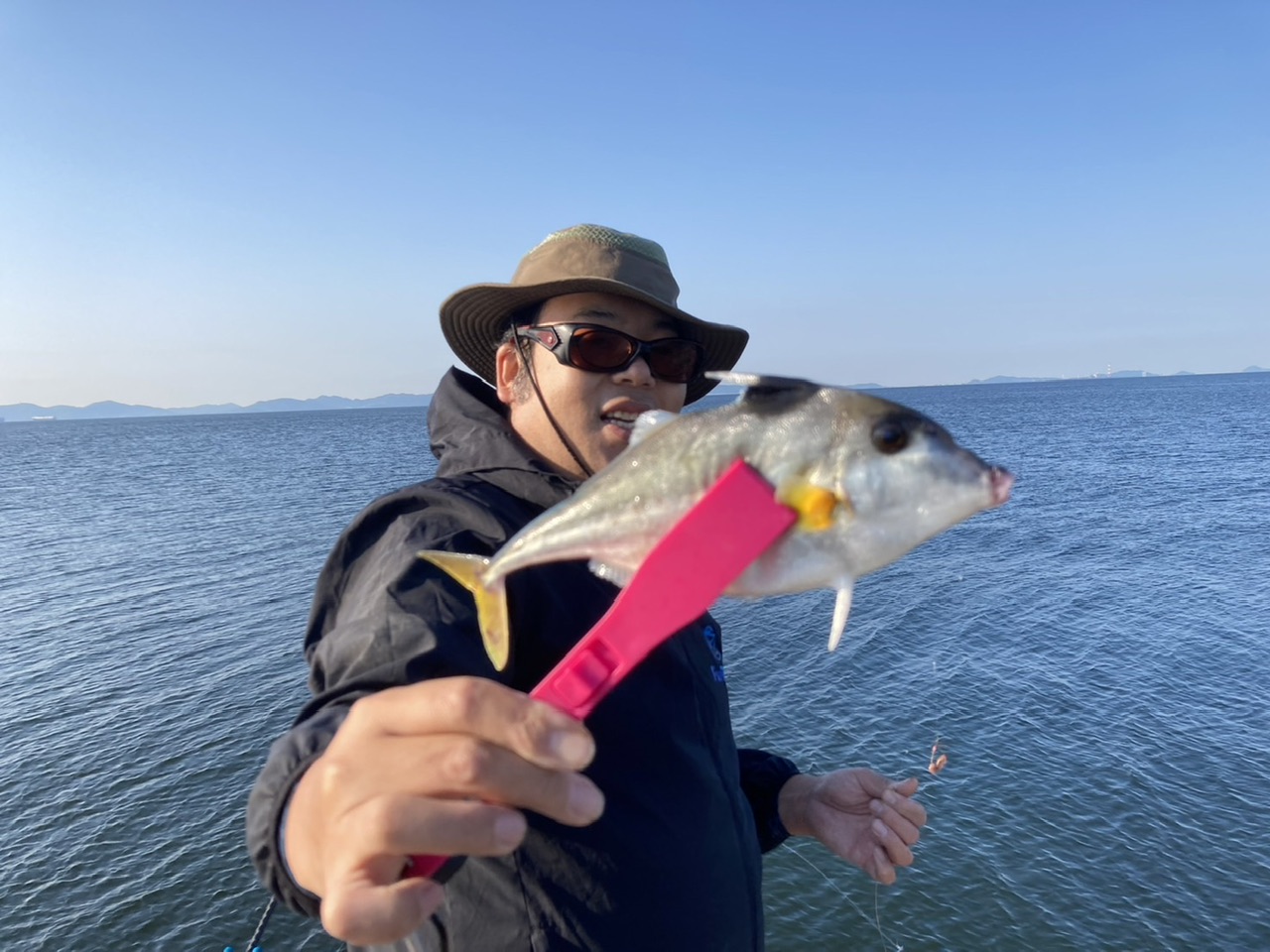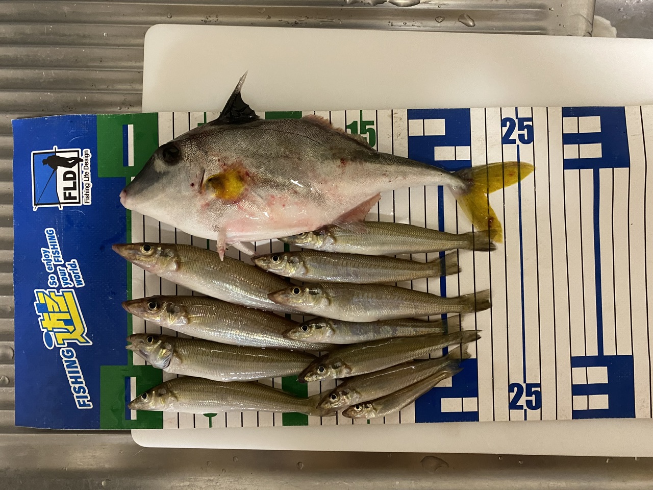 当店内藤と二人でキス釣りに行ってきました。アタリはあるが中々掛からない状況の中、なんとか二人で釣れました。仕掛けのサイズは6号を使用しました。根も多かったので手がしよく、2本バリの仕掛けメインです。アタリのゾーンは30~40m位のラインでよく当たったので投げるのも楽ちんです。キスのサイズはピンギスはいましたが15cm前後のサイズのキスも多くなってきています。この先、活性がもっと釣れて来ると思います。途中、よく一発よく引くアタリだったので大型のキスかと思っていたら、ギマも上がってきました。朝の干潮付近までやって帰りました。帰ってからはやっぱり定番のテンプラ♪また釣りたいと思います♪