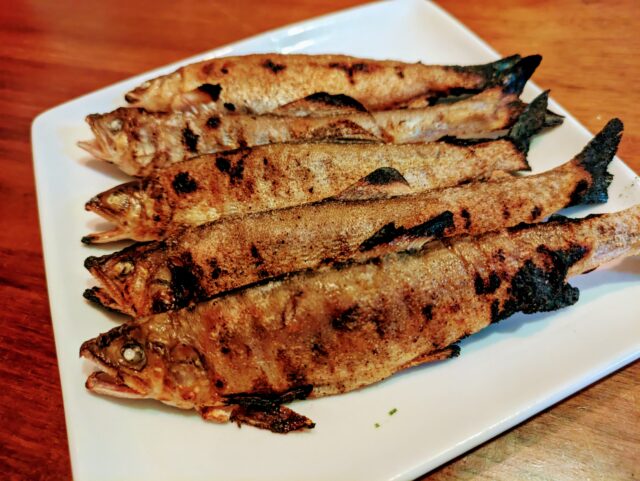 解禁したばかりの郡上へ鮎釣りに行ってきました。到着時9時半でコダチ裏からスタートしました。初っ端瀬肩から始めてポツポツ釣れ続けながら、途中で泳がせもしました。瀬の中で釣れる鮎は18〰19センチくらいで、泳がせると15センチくらいと小ぶりサイズが釣れます。午前中目一杯やって込み12匹!この調子で釣れるかな?とご飯を食べてから高鷲浄化センター前に移動して、準備中ポケットから携帯電話を取り出そうとした時、手が滑ってそよまま岸壁に当たりながら携帯落水。そのまま14時で納竿しました。皆様も携帯電話落とさないようにお気をつけください。その後、釣った鮎を塩焼きにしました!夏の味覚鮎!美味しいですね。また郡上へ。釣りに行きたいと思います。