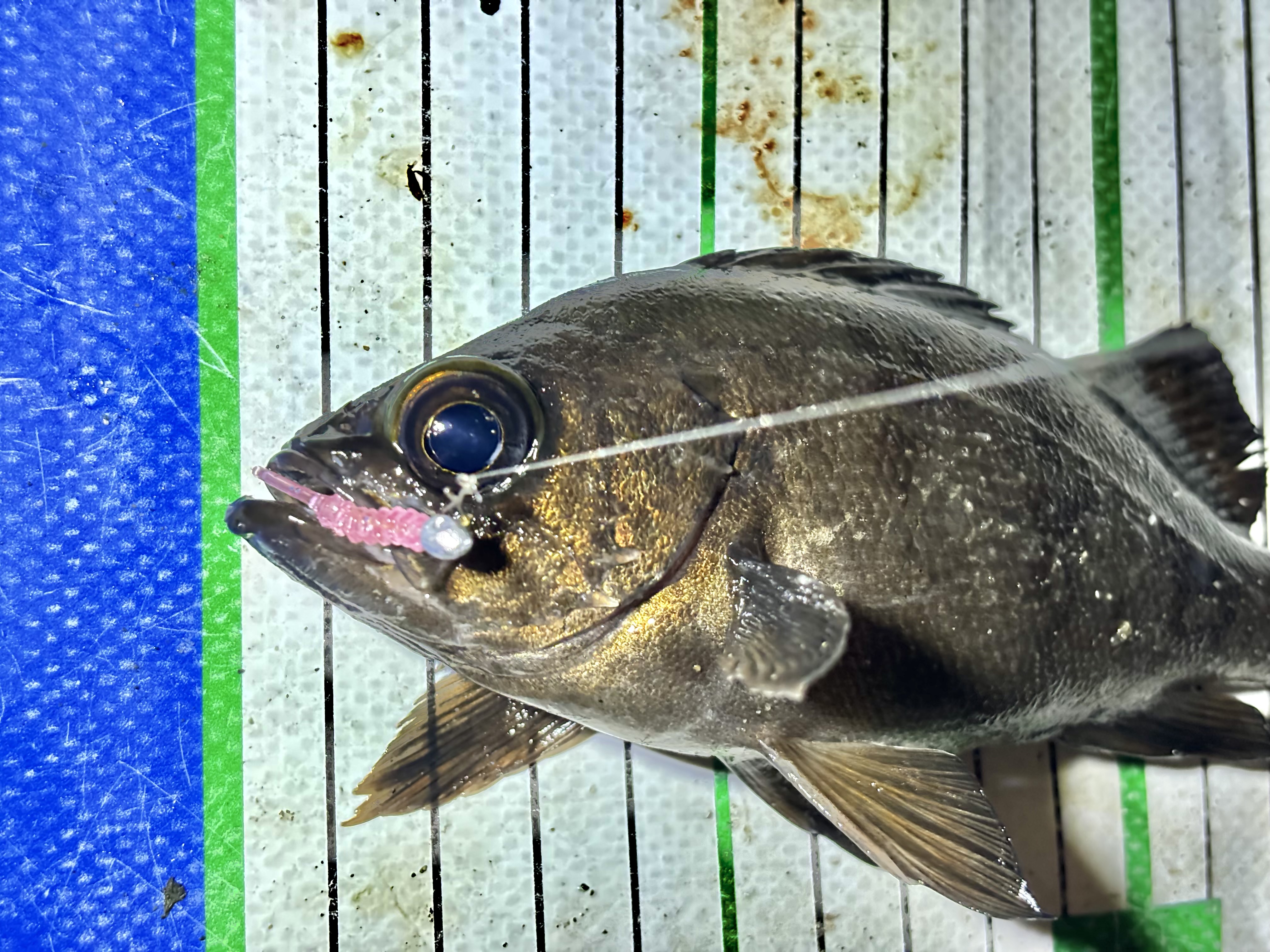しばらくするとメバルとは違うアタリ!でも乗らない。。あまりにも掛からないのでアーミーベイトを縦に半分に切って吸い込みやすいようにしてみるとようやくヒット!