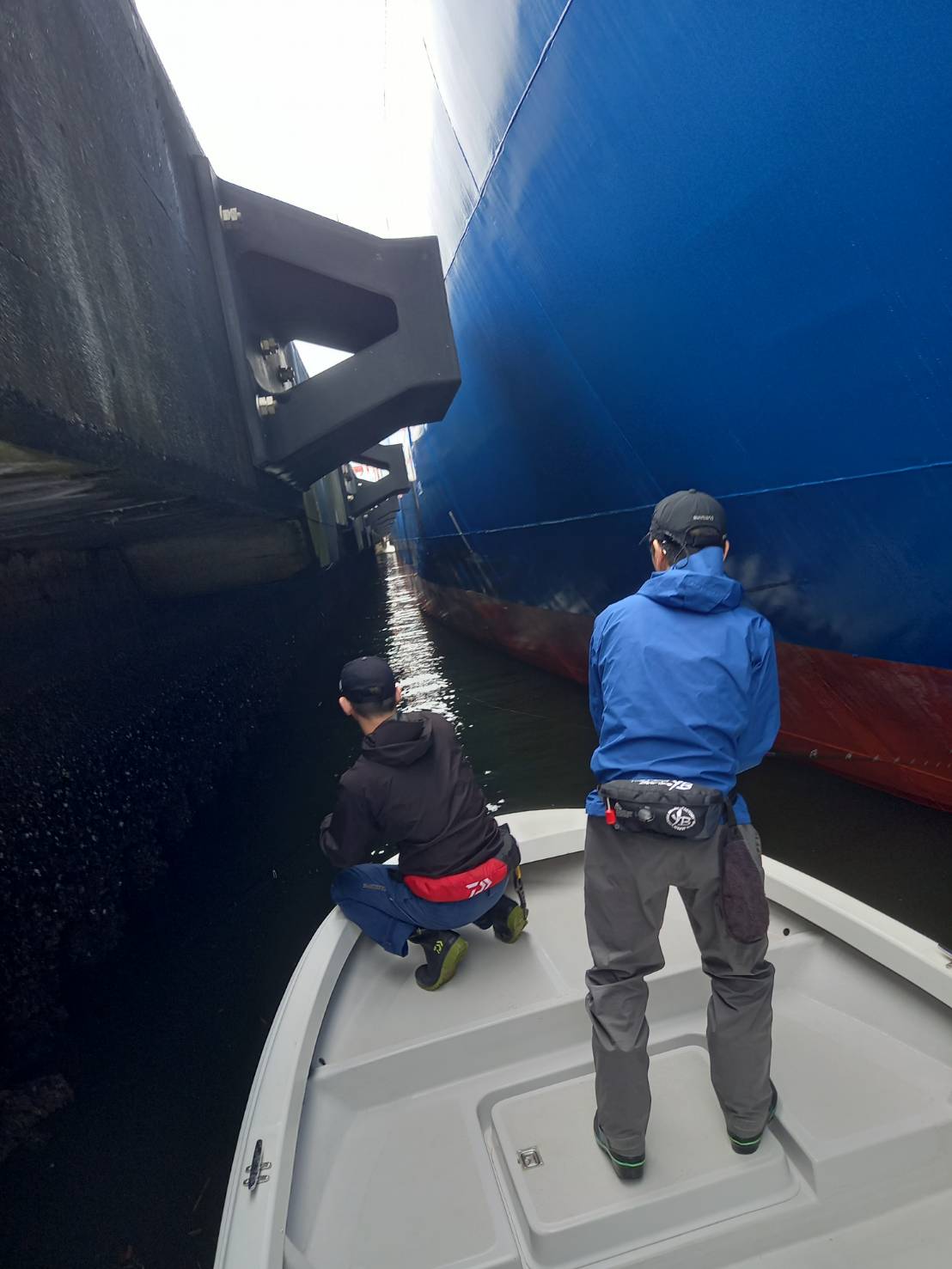 今回は船長が前日プラクティスをしており、タイミング次第では70cm超えで揃えられるかもとの事。バースのそばを狙い丁寧にルアーを通していくが反応は悪い。同船の横井さんにセイゴクラスのシーバスがヒットしますがバラシ・・・私にもアタリがありましたが、のらず・・・移動。船と岸壁の間。狭い所を後藤さんが撃つ。私は船のしたと、広くなっている方を岸壁ギリギリにルアーを通してくる。HIT!!まあまあ引く。感覚的にしっかりフッキングしていたのでこれはバレないだろうと高をくくっていたが、まさかの針折れ。再三の衝突で針が弱っていたようです。波に乗れない。