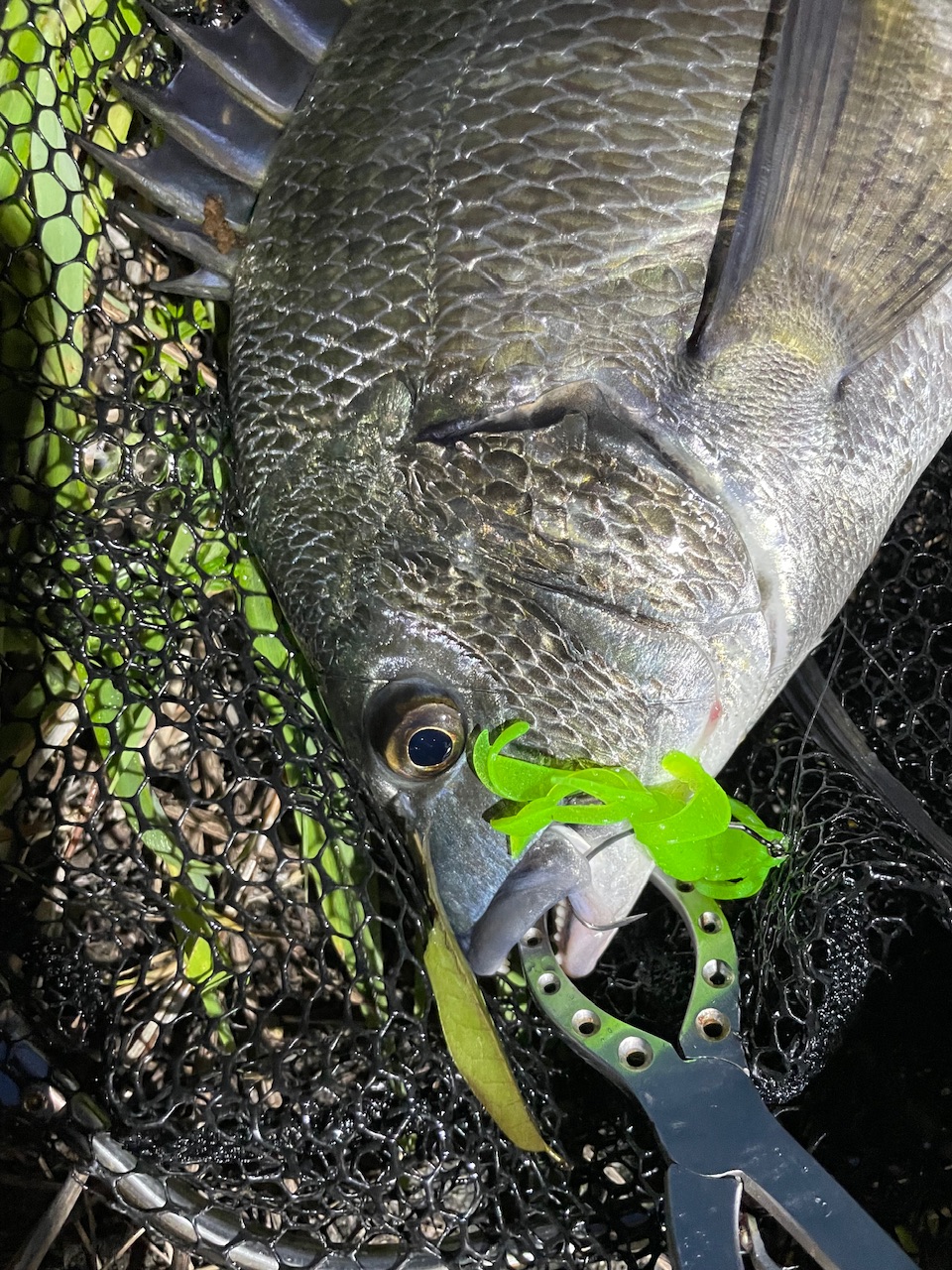 今日も仕事終わりに宮川直行!いつも通りクレイジーフラッパーのフリーリグ!カラーはブラックチェリーを使用。がアタリなし。そこで最近気になっている新色にチェンジ!クリアーチャートグロー!最近先輩はこれでずっと釣っている。付け替えキャスト。するとカラー変えて数投でヒット!!30後半の元気なチヌが釣れました!久々の1匹で満足!その後アタリが無くなり終了しました。