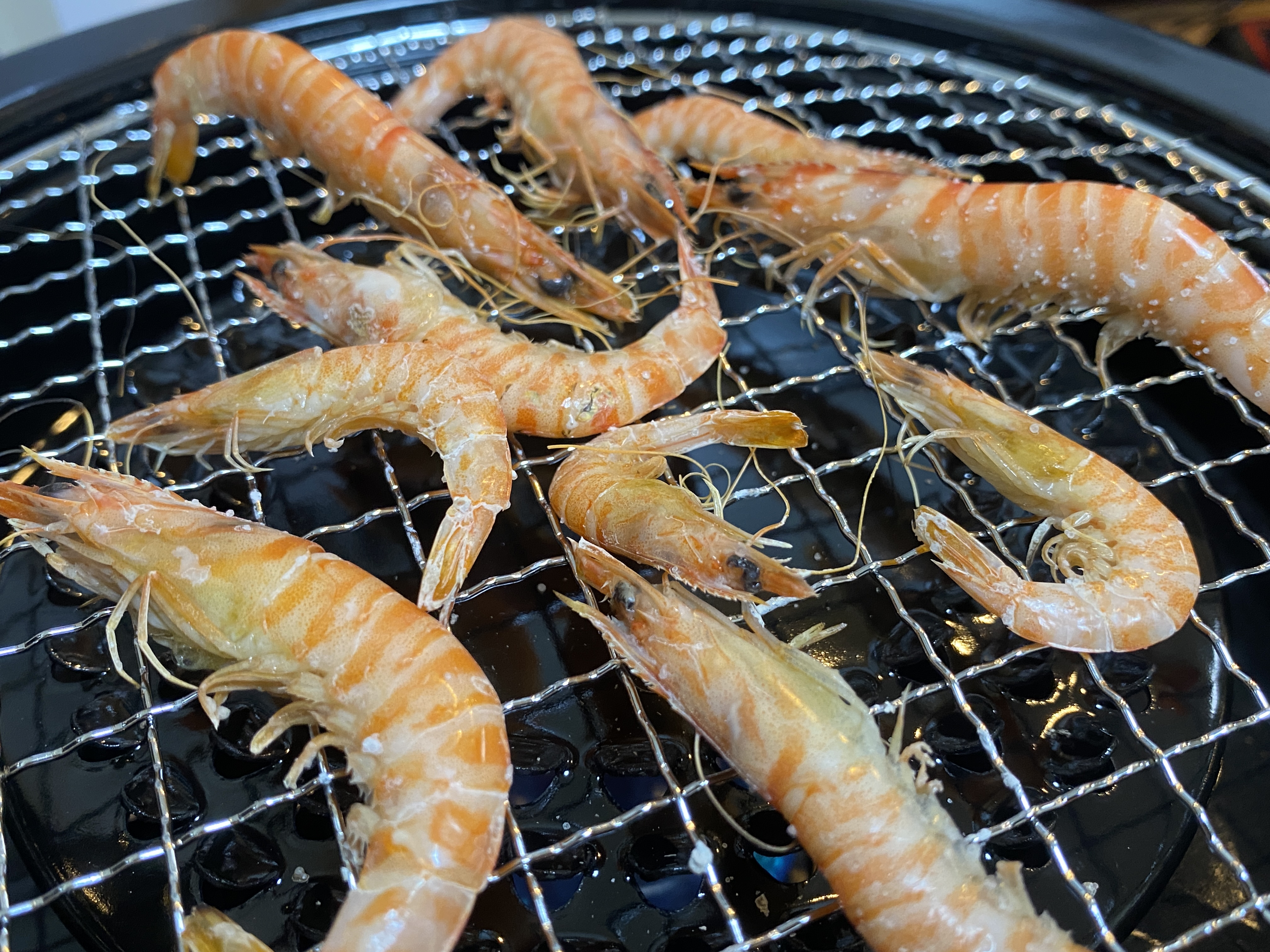 獲ったエビは網に乗せて塩焼き。 非常に美味です。