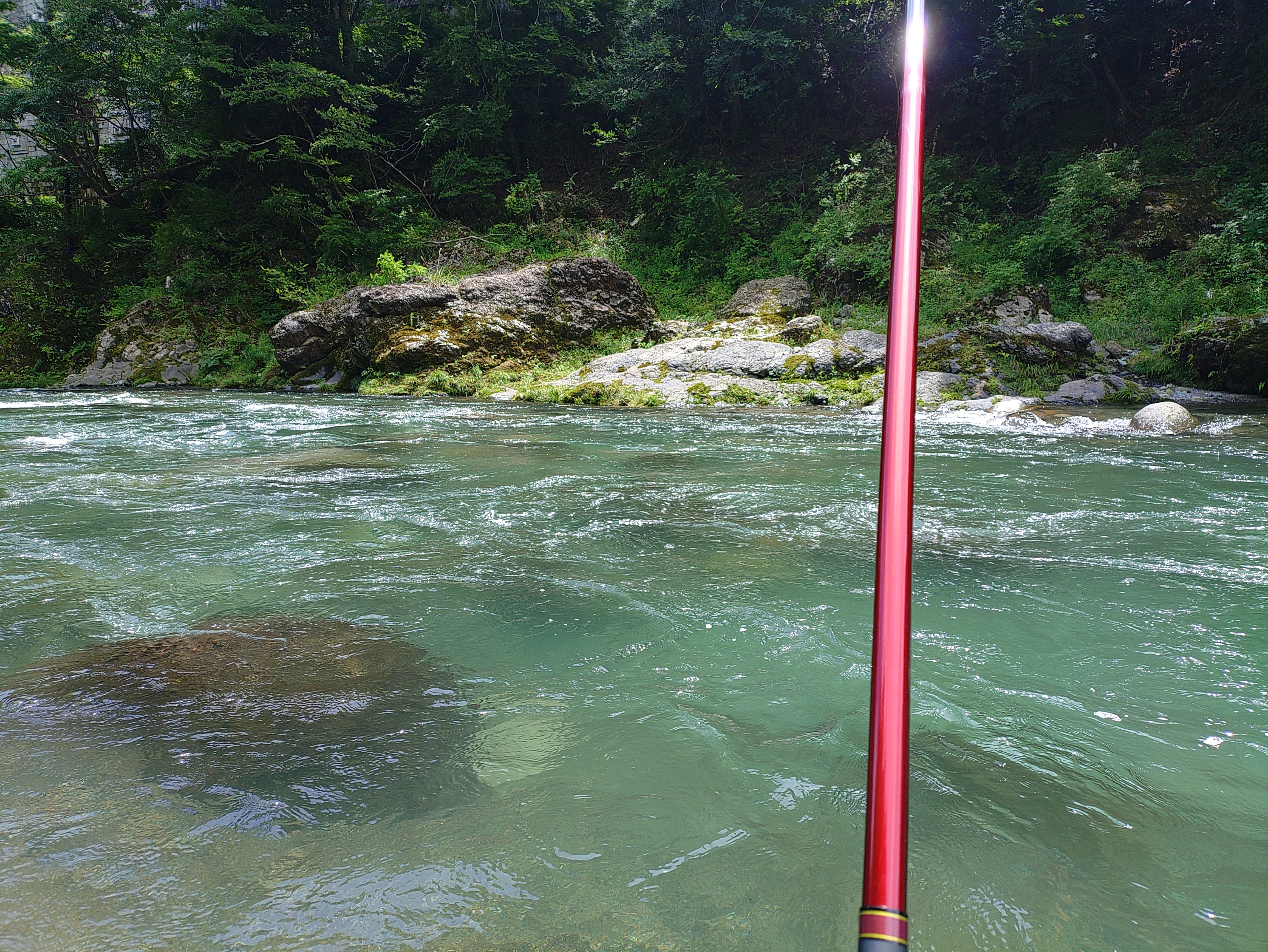 今回は、焼津街道店三浦店長が釣りまくっている山梨県大月市の桂川にチャレンジしてきました。今回は浅利川の出合に入りましたが、車がとめられないほど満員御礼。みんながはいる、目の前は避けて、下流の様子を見に岩盤沿いを歩き行ってみました。フチと深瀬の混合ポイントで良い石が入っていて、雰囲気満載の場所を発見!