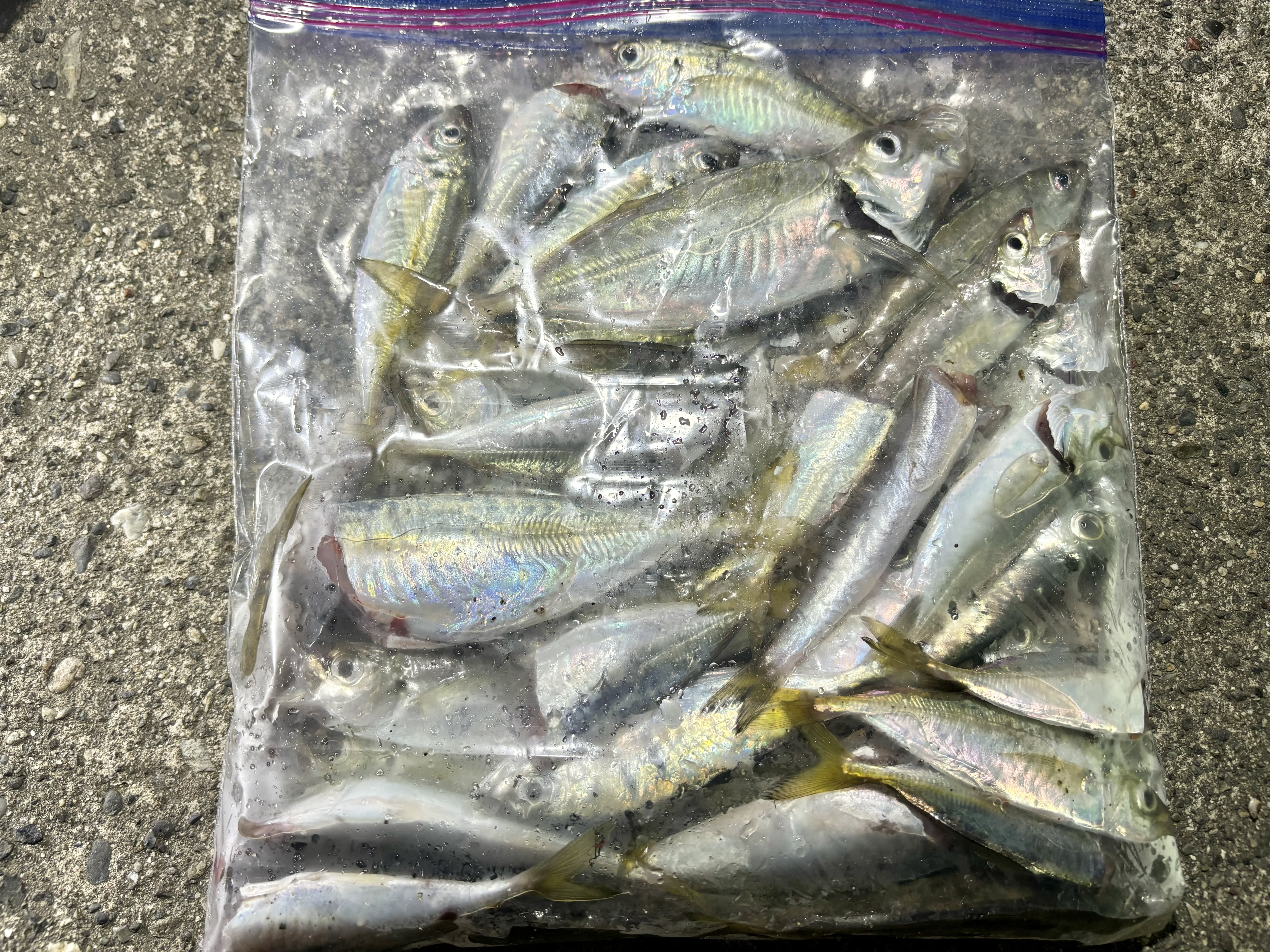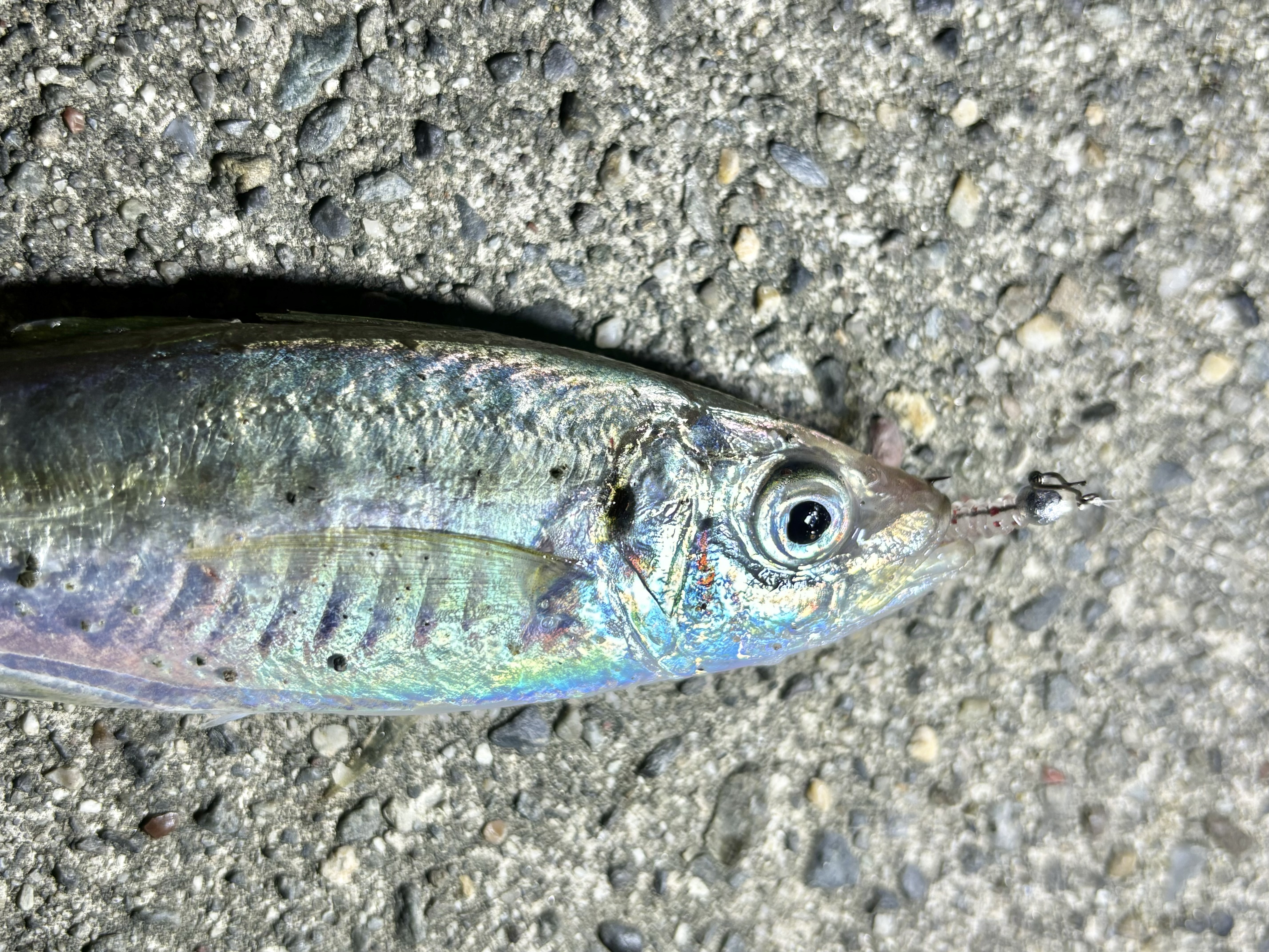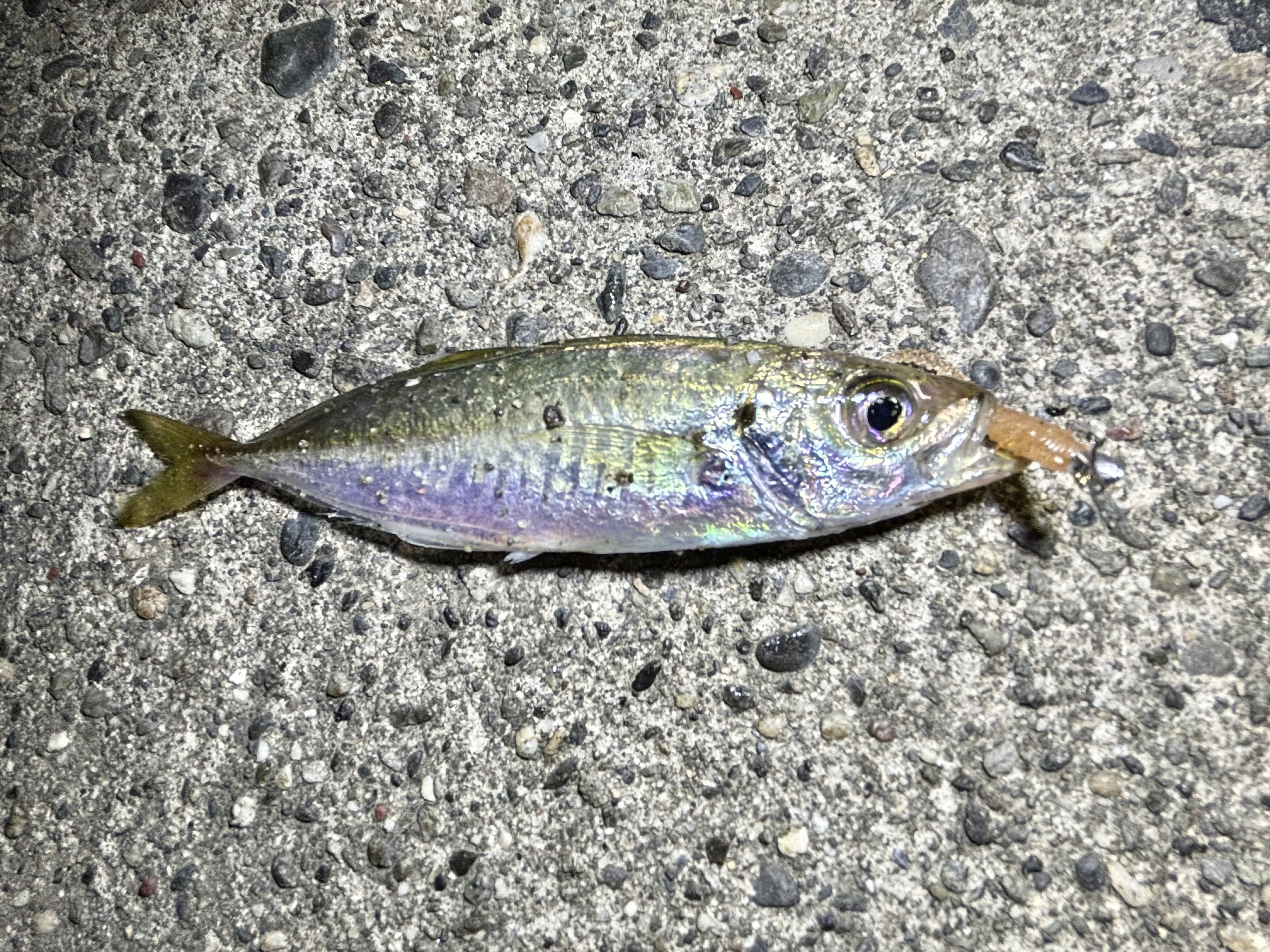 近くの餌釣りの方が帰られた直後にアジの大群が襲来!明暗を中心にボイルしまくりでアタリの数も先程とは段違い。サイズは小型が多かったのでアーミーベイトを使ってみるとようやくヒット。10㎝前後でしたが釣れればヨシ!