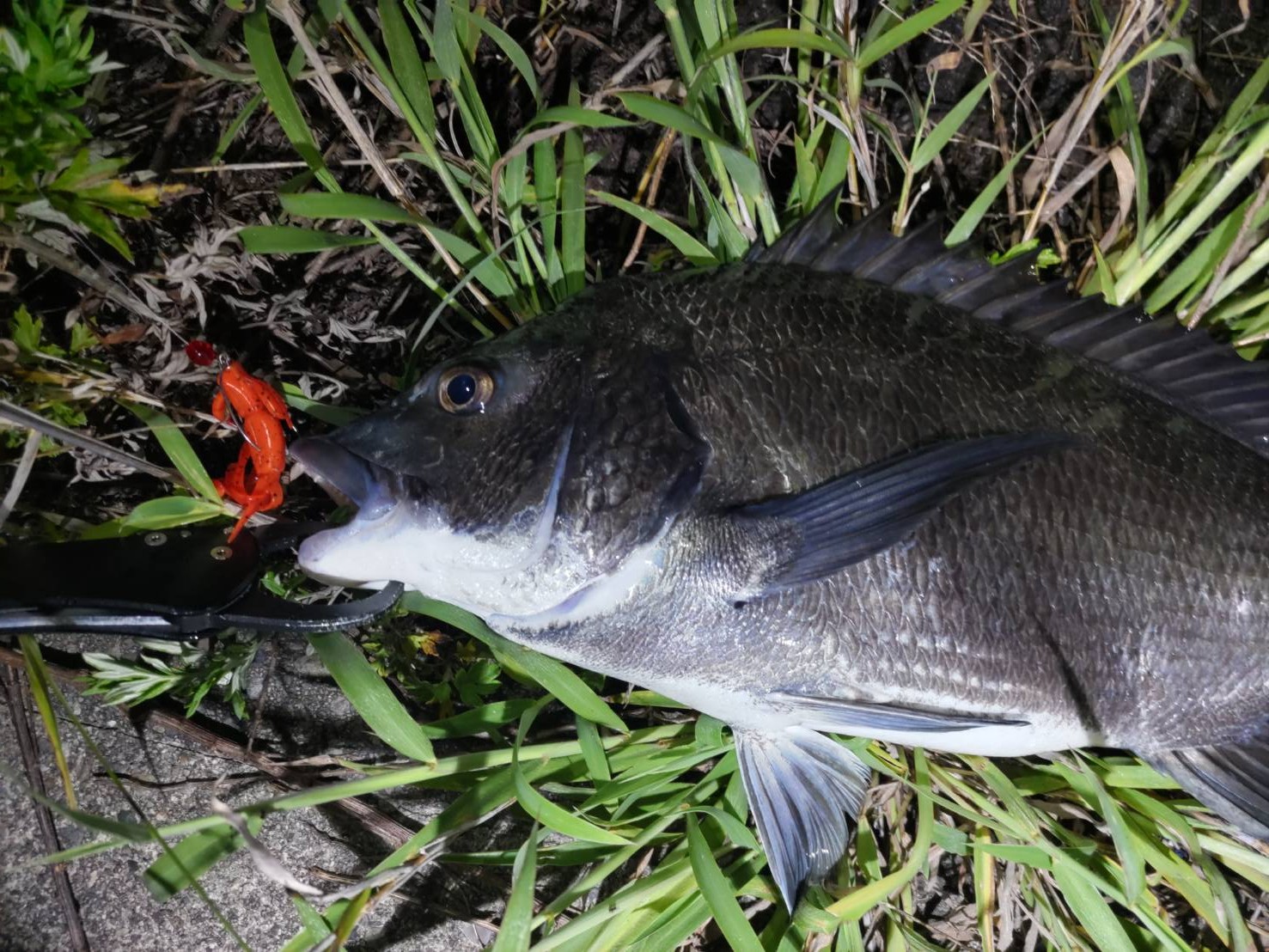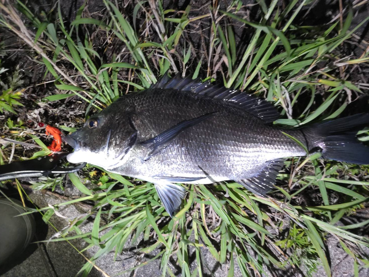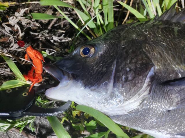 すっかり日課となってしまった1枚釣って終了釣行!この日の参加者は5人!みんなチニングの魅力にどっぷりハマっています(笑)今回のリグは私が一軍にしているクレイジーフラッパーのデルタクローを使用したフリーリグのガラスビーズチューンです!チューンと言ってもガラスビーズをシンカーとフックの間に入れてるだけですが(^_^;)ガラスビーズの効果でチヌが釣れているかは定かではありませんが今シーズンこのリグにしてから釣果が安定していることを考えると私の釣り方と合っているようです!ちなみにワームのカラーは気分や周りの釣果に合わせて変えています!その中でも特にお気に入りのデルタクロー!やっぱりいい仕事してくれます!写真のチヌを連れてきてくれました!気のせいかもしれませんが最近はズル引きよりもボトムバンプへの反応がいいように感じます!もちろんズル引きも混じえながら釣りですがボトムバンプとガラスビーズの相性がいいのかもしれません!みなさんも自分に合ったリグと釣り方を見つけてチニングを楽しんじゃってください!