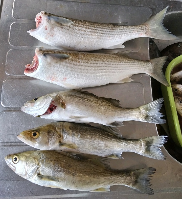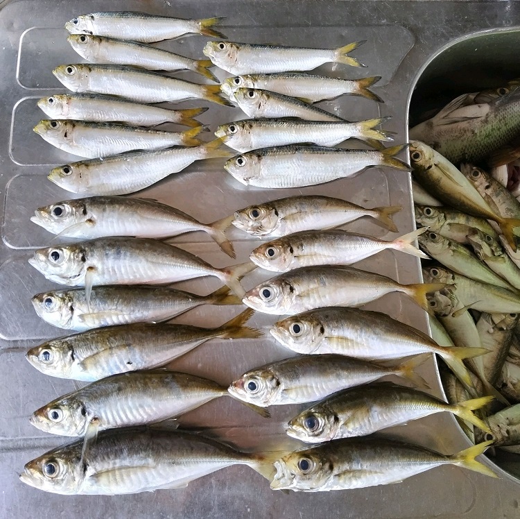 昼間のキスは前線によるうねりで釣りにならず断念して夕暮れからセイゴ探しから入ります。ポイントに入り暗くなって来た頃 アタリを掛けると飛ばないのでキビレかボラ決定ですがなかなか寄らずやっと浮かせたのはボラでした。エステル05号でも全然捕れるのですが時間が掛かるのが欠点です。その後アタリが出ないので少し動いて投げた1投目にアタリ!掛けにイクとジャンプ!暴れるセイゴをネットに入れて確保、すぐに次を狙うとヒット!同じサイズを追加して投げる方向を変えるとまたセイゴがヒット!これもネットに入れて確保そこからアタリが出なくなり小さな群れだったのか と思っていると モゴモゴモゴ とアタリが出たのでアワセてみるとロッドが曲がる~ 飛ばないけどまたボラか?やり取りをしていると浮いて来た やはりボラでネットに入れて確保、これでアタリが無くなり移動、少し早いがアジのポイントを見に行くと場所は空いているが肝心のアジが居なくて— 何か触るが 何度も投げて軽いアタリを掛けにいくと掛かったのはサッパでした・・・アジより超絶難しいサッパをポツポツ追加していき10匹を越えたので一端休憩します。これで人が入ったらお手上げですが それはしょうがないのと帰りの運転もあるので1時間半休憩してからポイントへ入り投げると前日より反応が少ないがアジが何とか釣れ3時半に終了して帰って来ました。