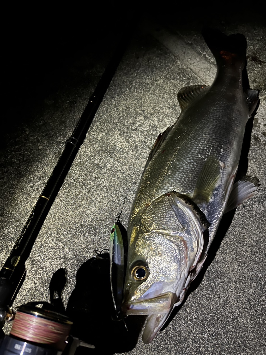 急いで車にルアーを取りに行き、持っていたスイッチヒッター85Sを岸沿いにキャスト!!スローに巻いてくると、ガツンときました!