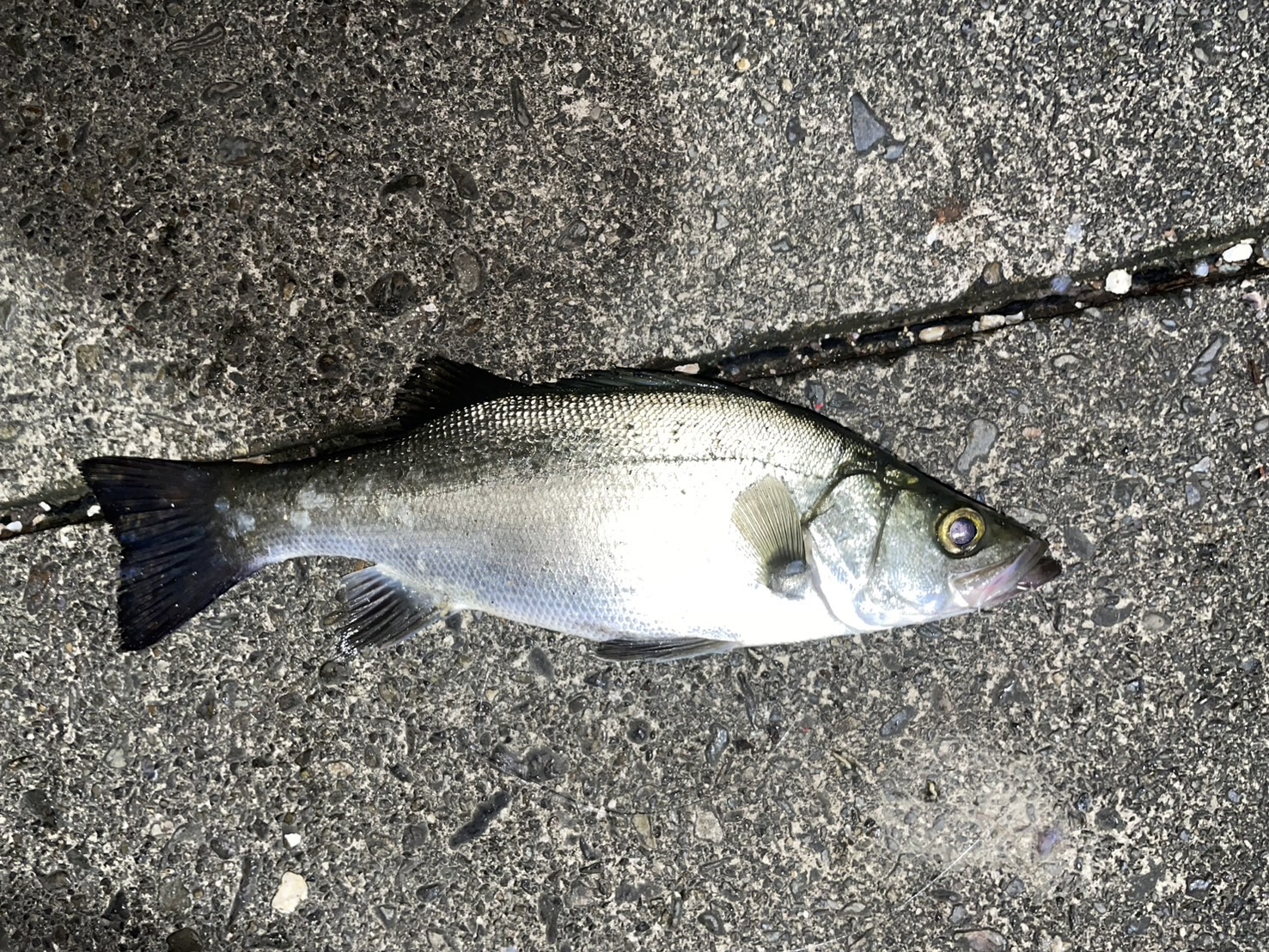 影との境目を泳がせると喰われた!30秒程食い込ませてフッキング!35センチくらいのヒラセイゴゲット!