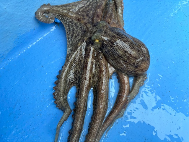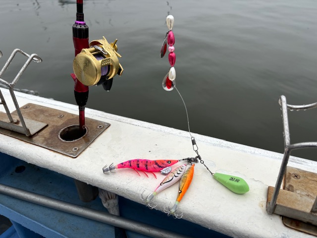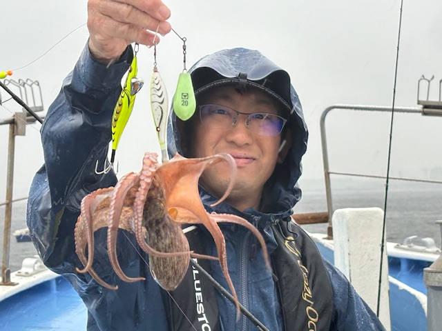 玉や丸さんで、タコ釣りに行ってきました。当日は朝から結構な☔️予報ですが、波、風は問題ないという事で出船!6時出船で、ポイントまでは20分ほど走った名古屋港付近、水深7から9メートル。オモリ30号で、スッテ、エギなどをスナップで3個付けしてスタート!船中はポツポツ上がっていますが私には反応がないまま、10時前頃時合なのか、船中も騒がしくなってきた中、私にも待望のアタリ!うれいし一杯を上げると、そこから連続で3杯追加!1つバラしを挟んで、さらに1杯追加して13時に沖上り。雨の中、前半は厳しかったですが、5杯釣る事が出来ました!船中は57杯、竿頭はなんと13杯凄い!食べても美味しいタコ今が旬です。