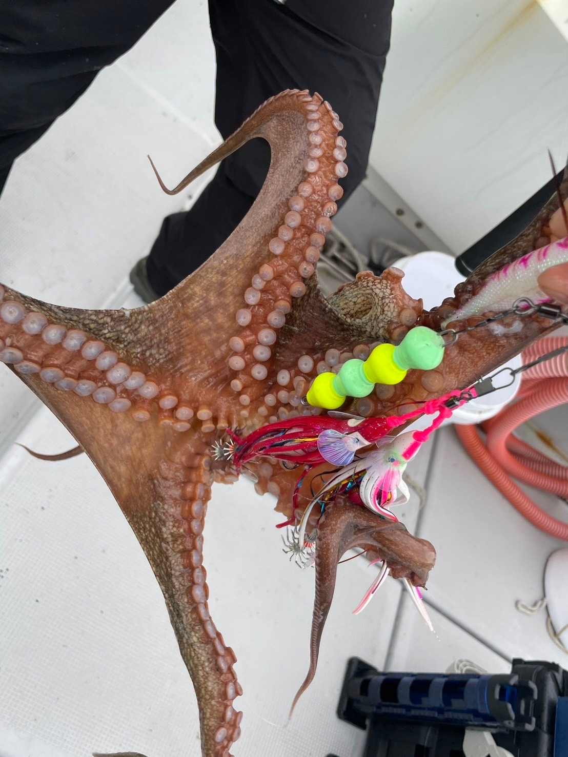 朝一はタコ狙い。根掛かりに注意しながらしっかり探っていきます。長い沈黙の中、ファーストヒットは東郷店小笠原さん!続いて岡崎店熊谷さんにもヒット!お二方とも派手目のカラー、夜光オモリを使っていました。