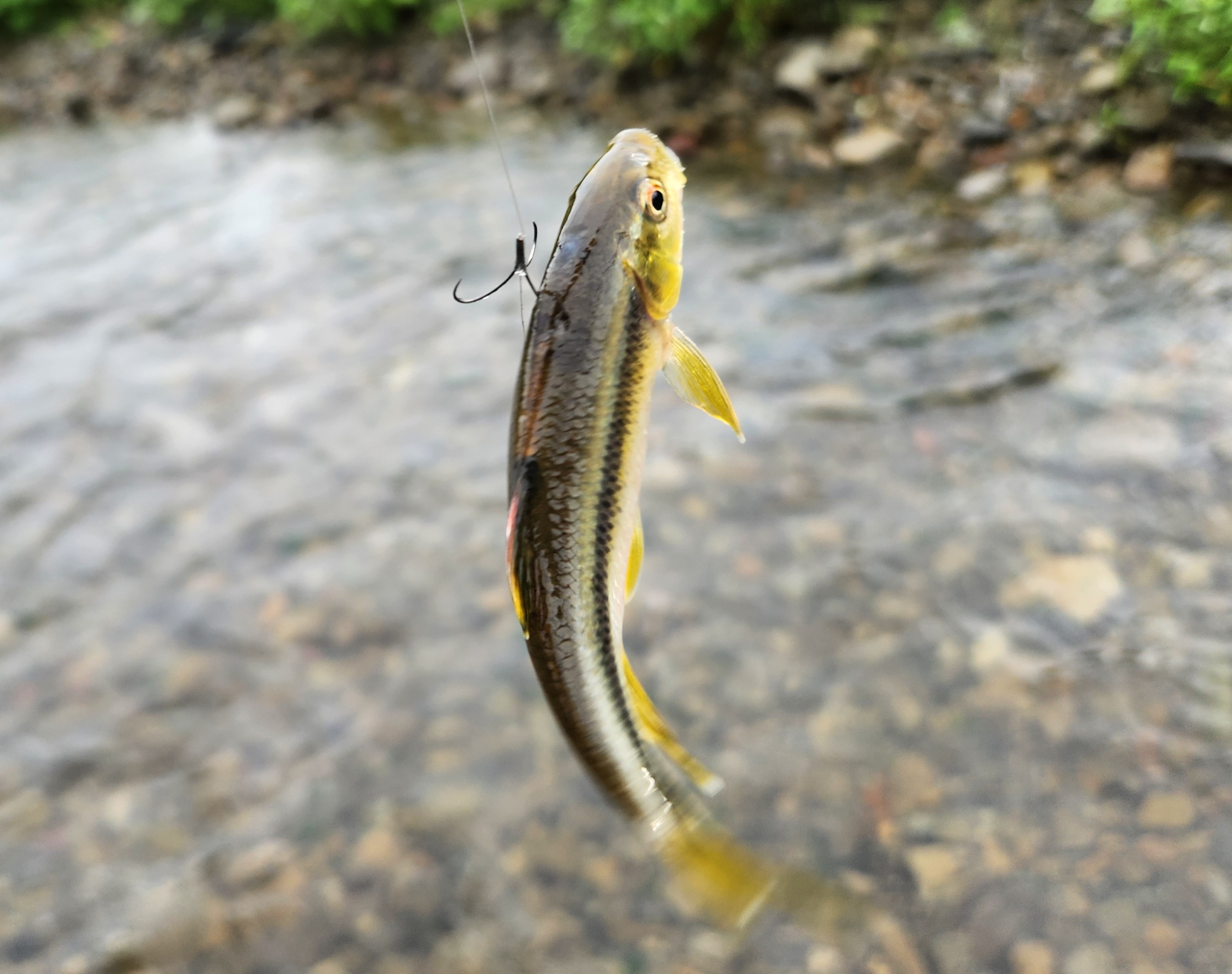 ファーストヒットは小さい謎の魚でしたが抜き上げで外れて確認する前にさよなら。お次は小さいカワムツ?らしき魚でアユは何処へ。川を歩きながらルアーを流していきますがなかなか反応なく、ようやく釣れたと思ったらまたカワムツ?のサイズアップ。