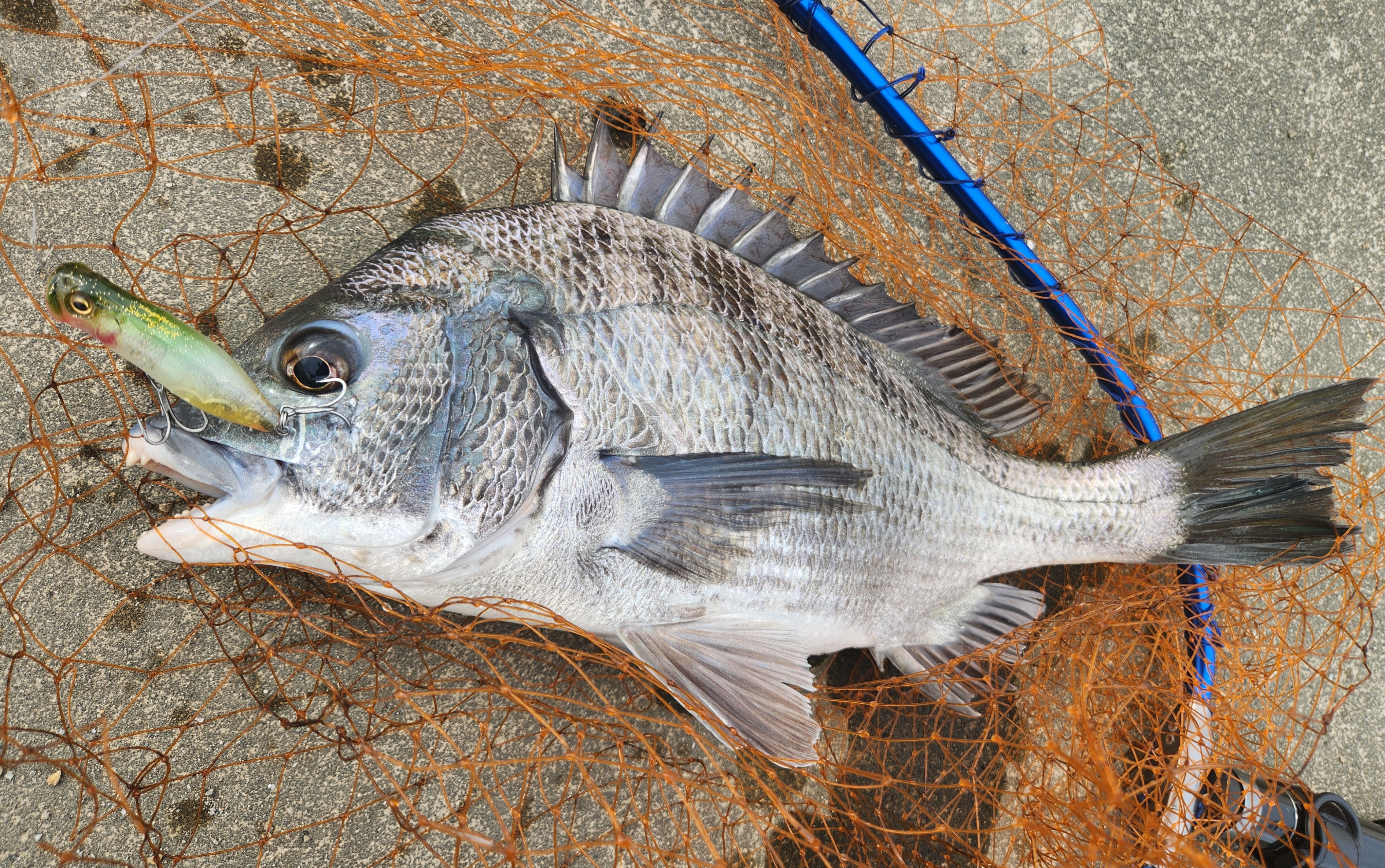 ポイントへ着くと雨はすっかり止んでいて微風&曇りでいい感じ。ポッパーからはじめてみると早速反応あり。色々ルアーを変えながらやっていくと後ろがモワッとしたり水面にでるバイトもありました。メガバスさん「スイホウ」に変えてキャストすると着水と同時にバイト!しかしのらず。そのままポッピングで誘うとまたバイト!しかしのらず。ロッドをシェイクしながらゆっくり巻いて首振りアクションに変えるとチェイスしてきてそのままヒット!寄せてきて無事ネットイン!チヌが釣れました。